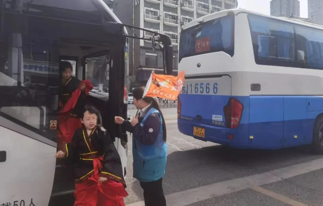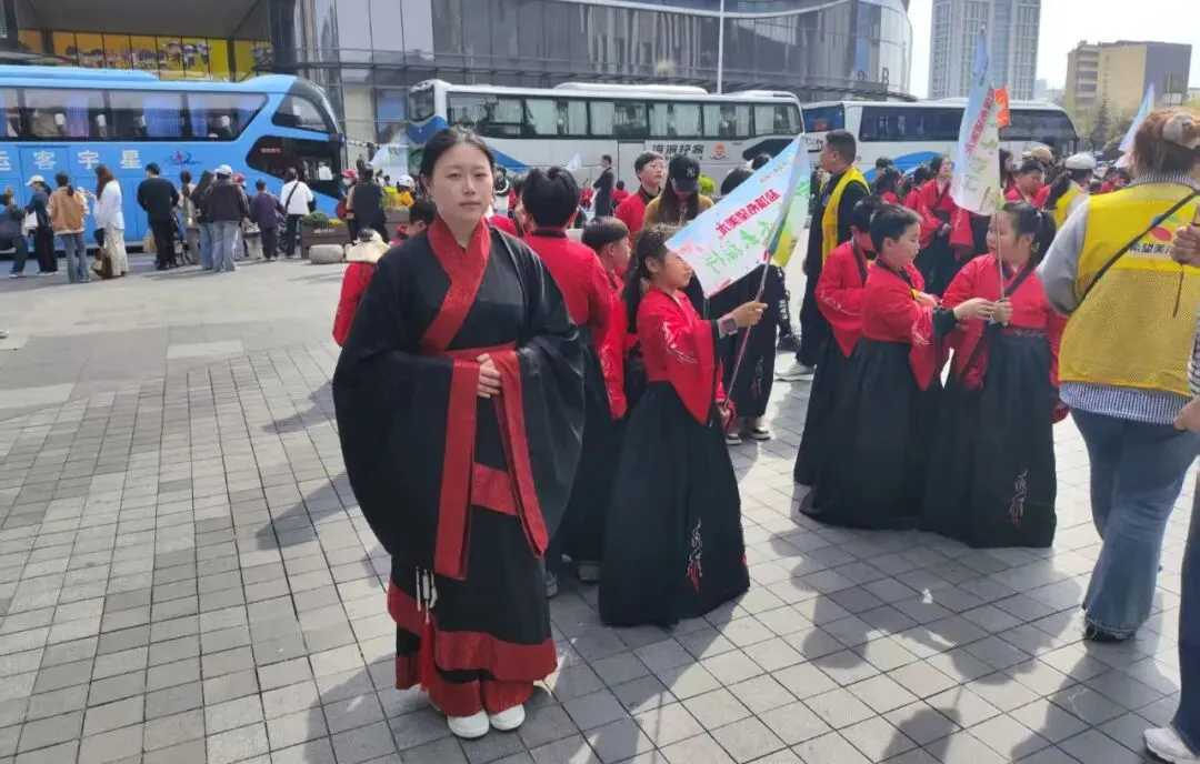 活动期间,近千名来自盐城的师生分批走进文庙与黄楼,沉浸式感受徐州千年文脉。面对人数多、行程紧、汉服研学等挑战,学子们分工协作:在文庙入口热情引导,规划最优路线;在黄楼古建筑旁化身“小小讲解员”,生动讲述苏轼与徐州的历史故事;时刻关注身着汉服的小朋友,贴心提醒安全,妥善应对突发状况。