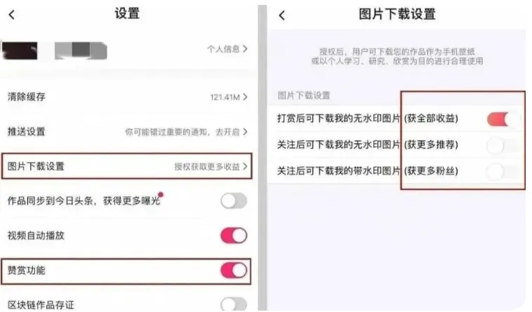 壁纸功能设置:壁纸功能相关三个开关打开,别人打赏下载无水印图片收益全归你(最少 1 元起),高浏览高收藏图片还有流量收益(与浏览量收藏量相关)。