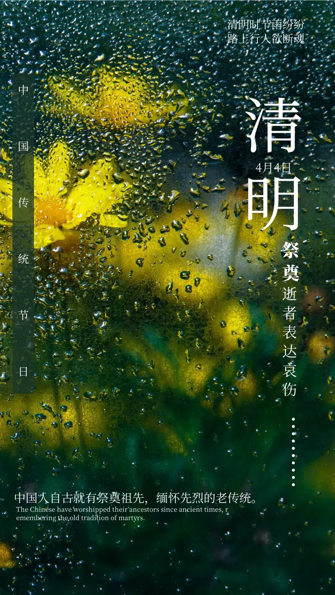清明时节细雨飞,点点哀思浸心田,一束黄花摆灵前,朵朵都是相思情,斟杯清酒敬先人,滴滴泪珠挂脸旁,纸钱纷纷满天扬,声声问候传天国,祝福先人永安息,庇佑亲朋皆安康!
