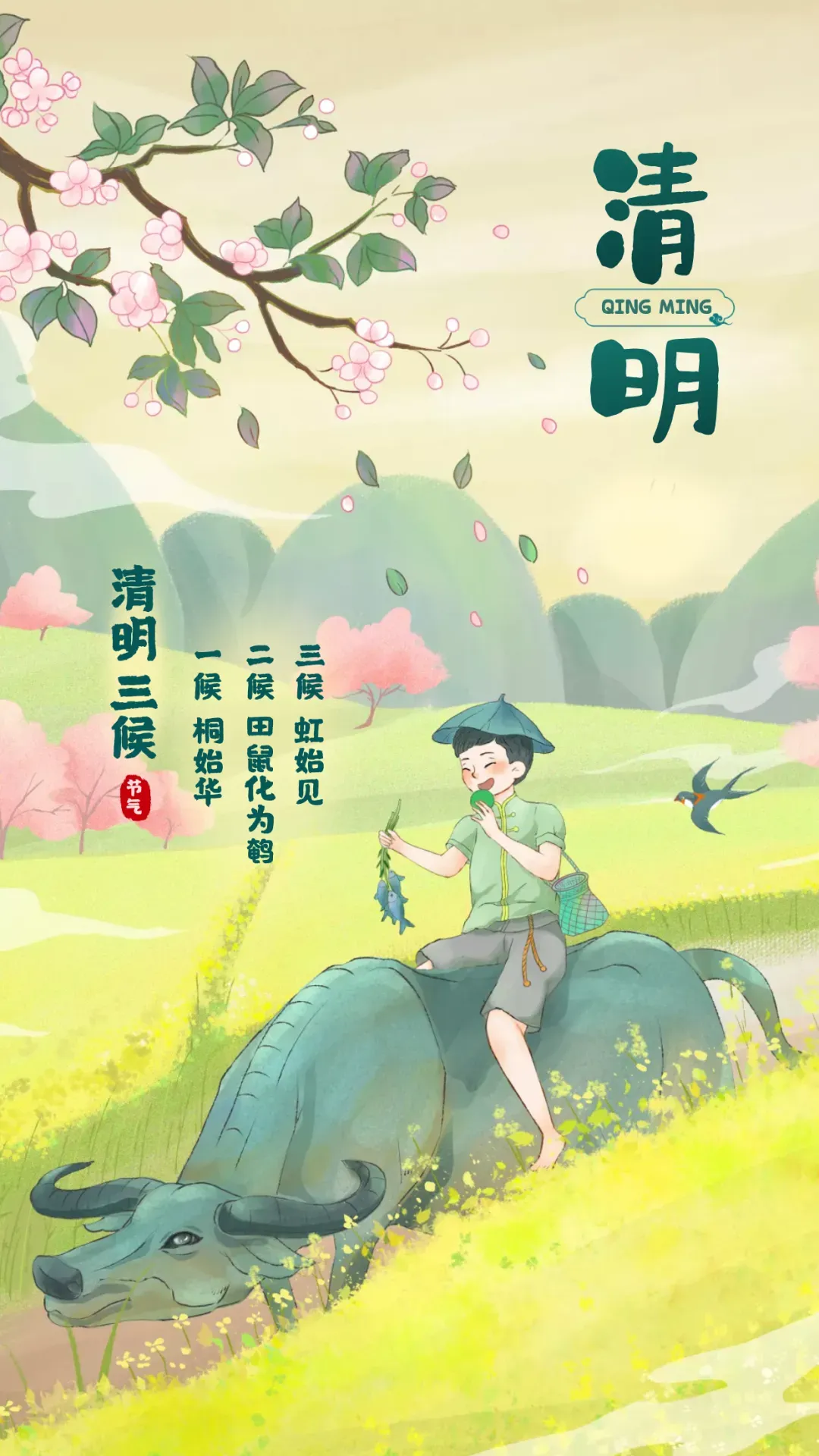 明节临近,春色入画来;桃红梨花白,千树万树开;燕子啄春泥,剪影长空裁;雨近云脚低,红湿左右摆;快乐随身带,踏青走起来;烦恼已无影,阳光心间晒;呼朋又引伴,谈笑尽释怀;春光无限美,俗事已无猜;短信先相告,愿你好心态!