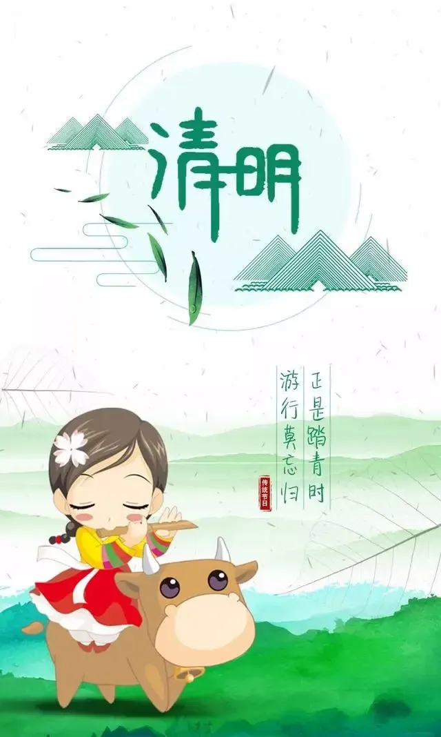 11.清明来,雨儿飘,踏青节里花儿俏。青青草,碧连天,百花争艳迎仲夏。忙播种,也嬉闹,且看硕果丰收到。探莺花,春醉倒,愿你幸福乐逍遥。清明节安康。