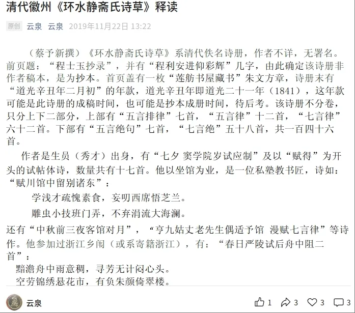兰溪友人蔡予新将其微信公众号《云泉》上的文章《清代徽州〈环水静斋氏诗草〉释读》推送给我。我通读全文后,顿觉兴趣盎然。虽然文章公开的诗作只是其中的一部分,但其中的有关信息却指向,这本诗作很可能是淳安先贤的著作。