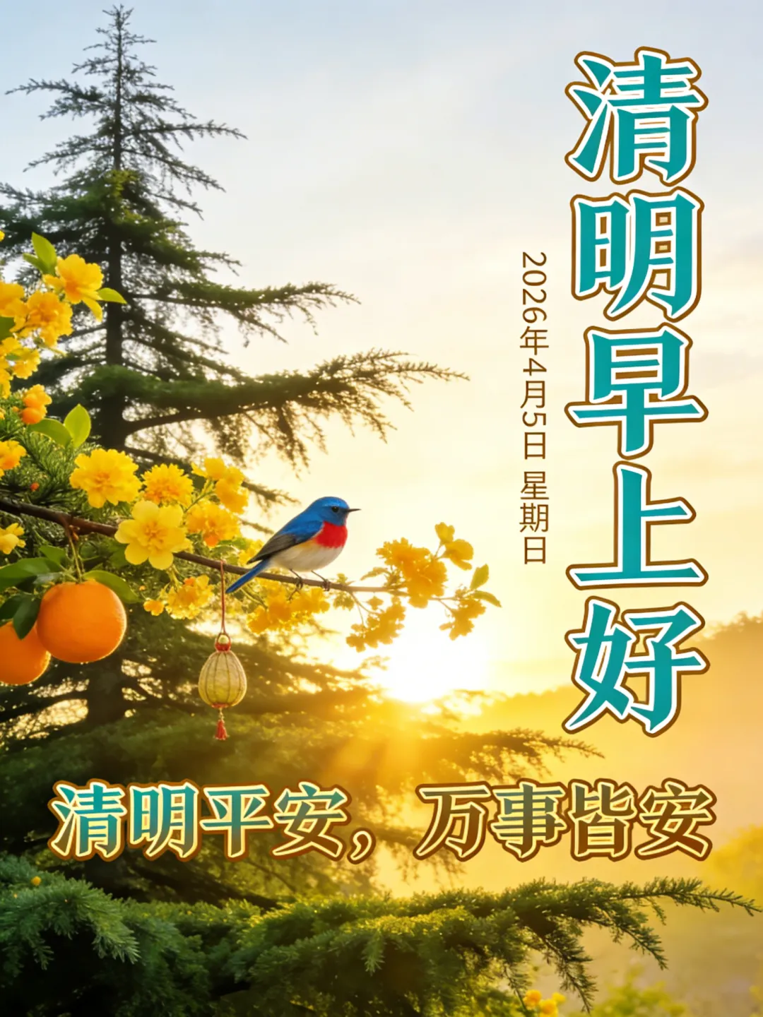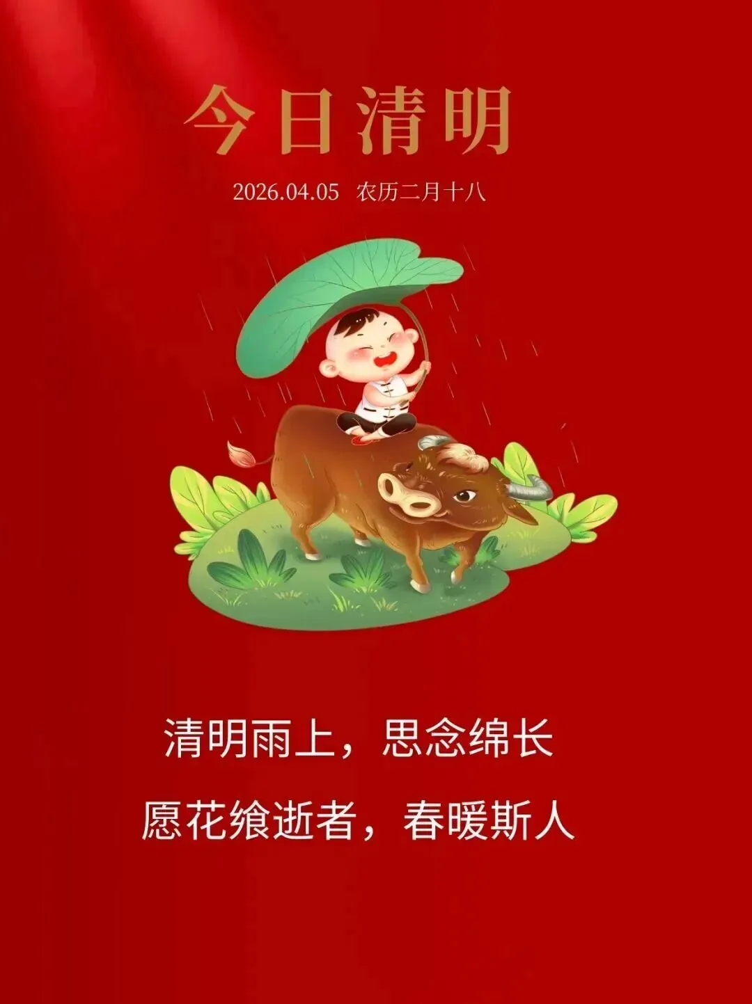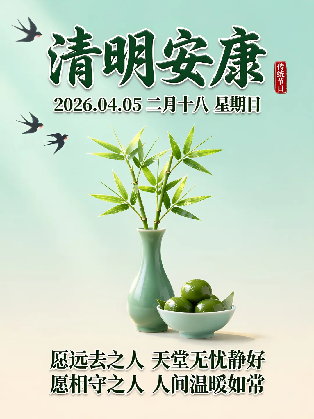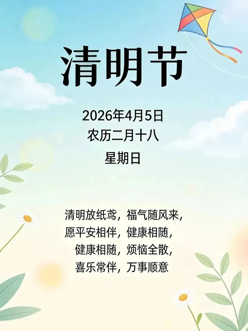 又是一年清明日,此时此刻莫忘记;清明祭祖日子里,缅怀先人要牢记;叮嘱祖先多给力,保佑年年都如意。顺心顺意百分百,清明节安康!