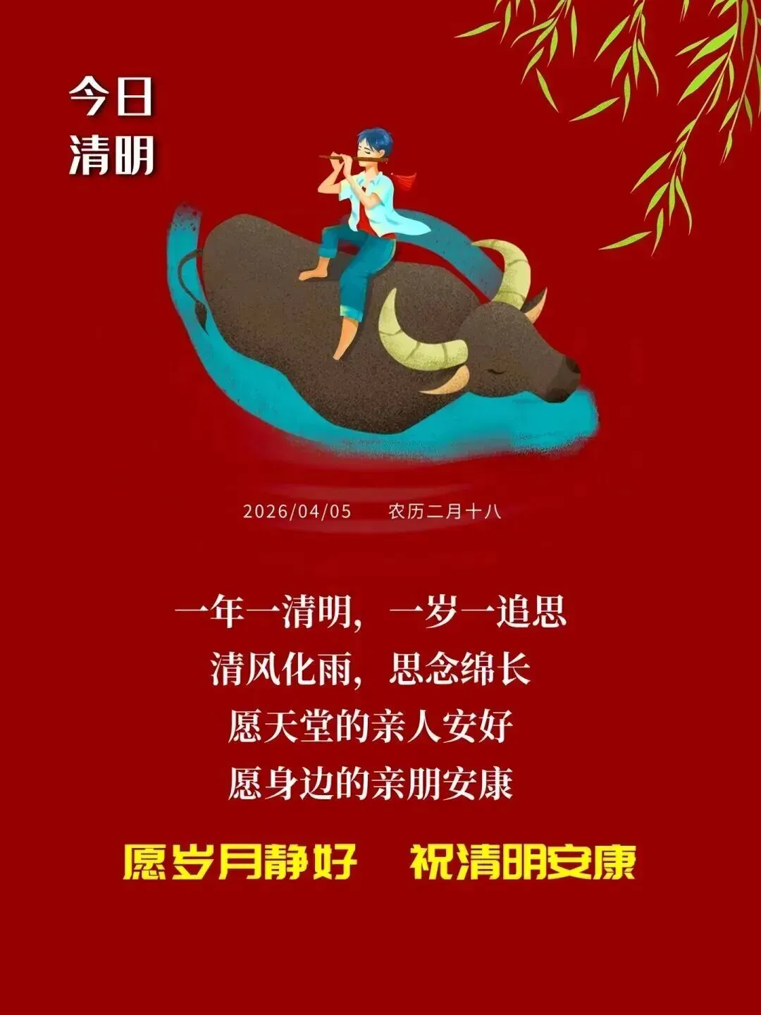 微雨洗青山,折柳寄故园;纸鸢牵旧忆,新茶敬流年。一春一追念,一念一潸然。 愿故人长安,生者康健,清明祥安!