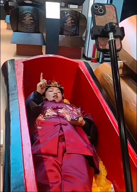 画面里,一个年轻女孩穿着暗红色绣花的中式长袍,表情平静得像一潭死水。她对着镜头缓缓转身,展示衣服的背面,然后——她真的躺下了。就那么直挺挺地躺在棺材里,双手交叠放在腹部,闭上眼睛。