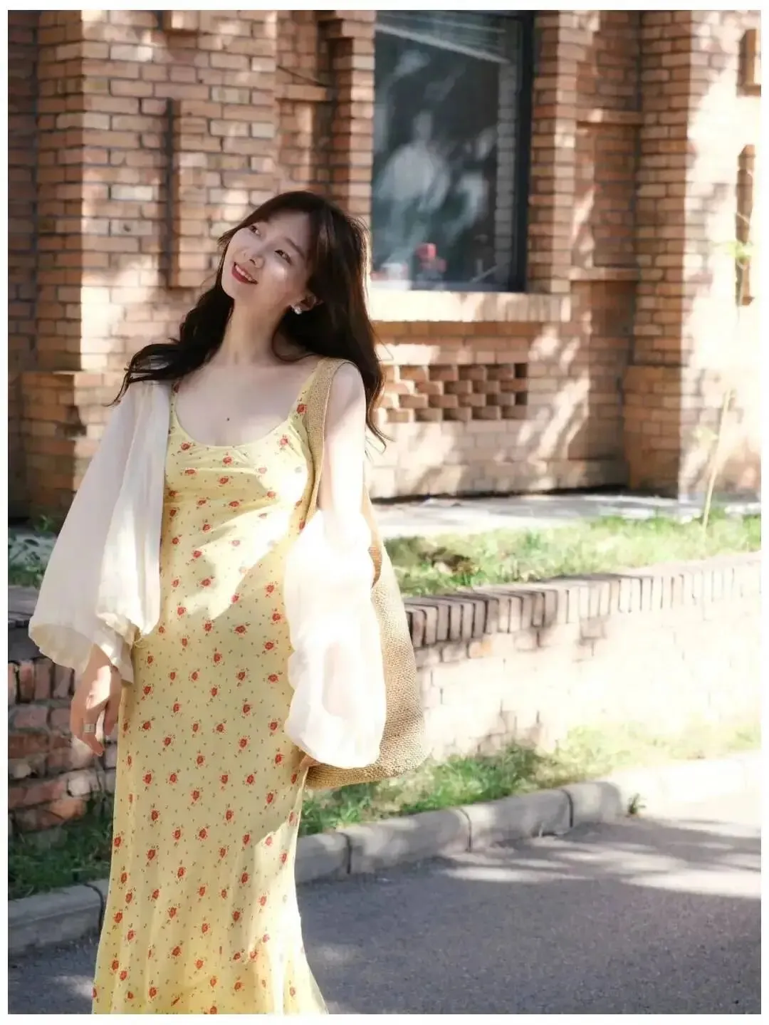 有的人不习惯直视镜头,那就别勉强,分脚站开一点,重心放松,头微微歪着,眼睛往下看,像看到地上的影子一样,再轻轻笑一下,这种照片很容易出温柔感,也会让人觉得你很松弛,它不是那种很炸的美,是很轻,很静,但很有味道,特别适合纯色裙子和光线好的场景