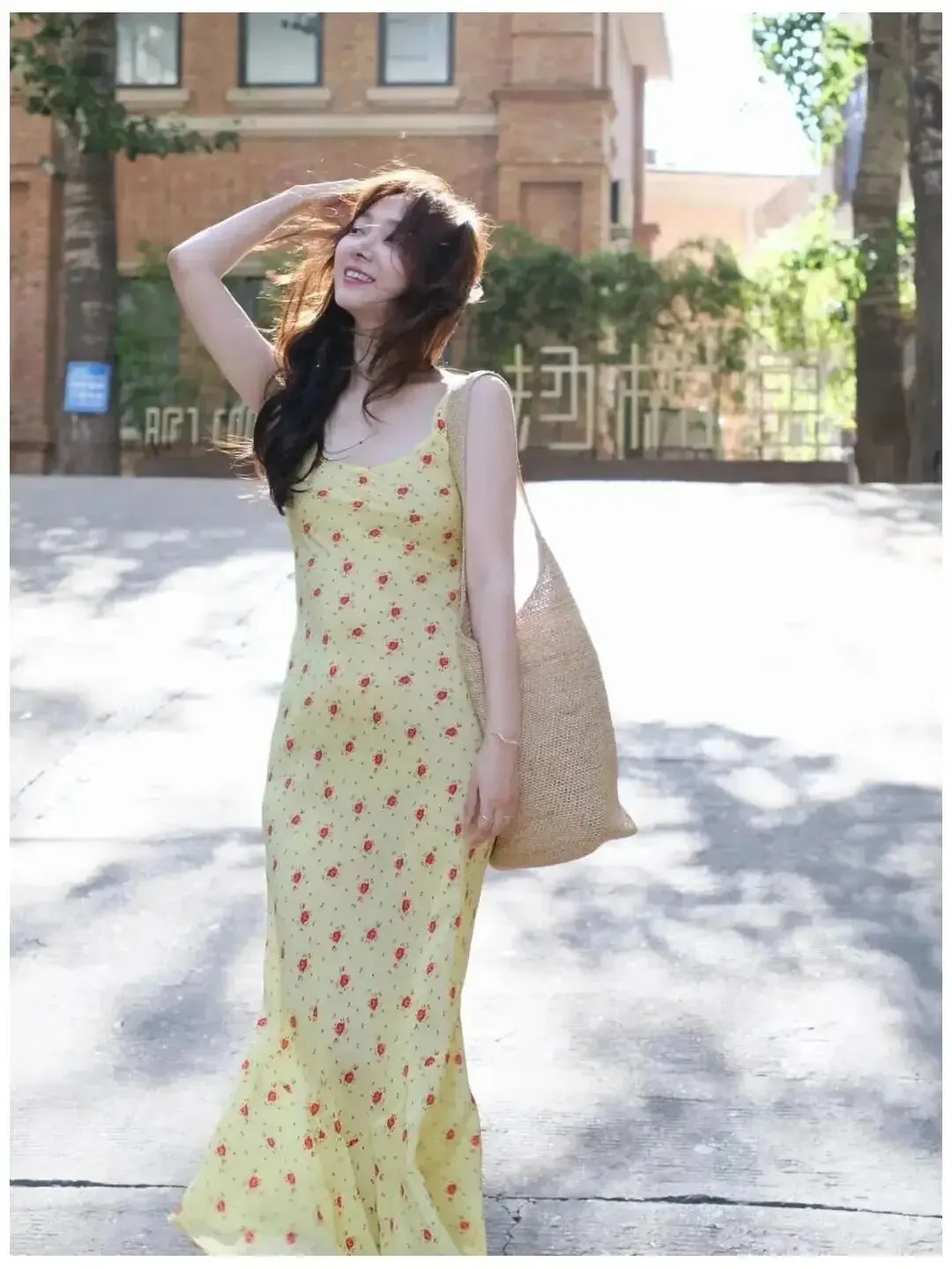 不会摆动作的时候,就让手去碰头发,轻轻抬手,把头发往耳后带一下,脸转到侧面一点,再看向远处,这一套下来,画面会立刻变得轻松,因为你的身体有了动作,镜头里的状态就不会死,尤其是长发和裙子放在一起,本来就很容易拍出柔和感,这个动作还能顺便修饰脸部线条,很适合拍半身和全身