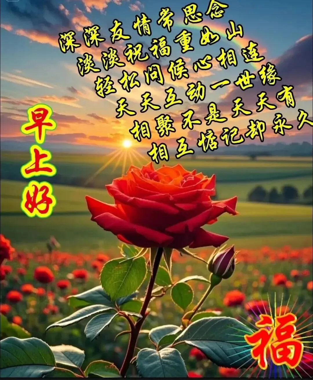 蓝天伴阳光,美景伴花香;友谊伴真情,祝福伴吉祥。不是年轻才快乐,而是快乐才年轻。愿我们心态健康,永远阳光。早上好!🌹❤️☕️🎉🙏
