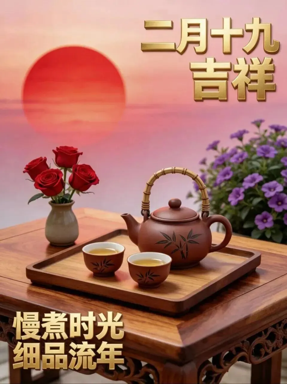 霞光满天,春风入怀。二月十九,愿你晨起舒心,日落欢心,日子可心,生活顺心,好运连连,