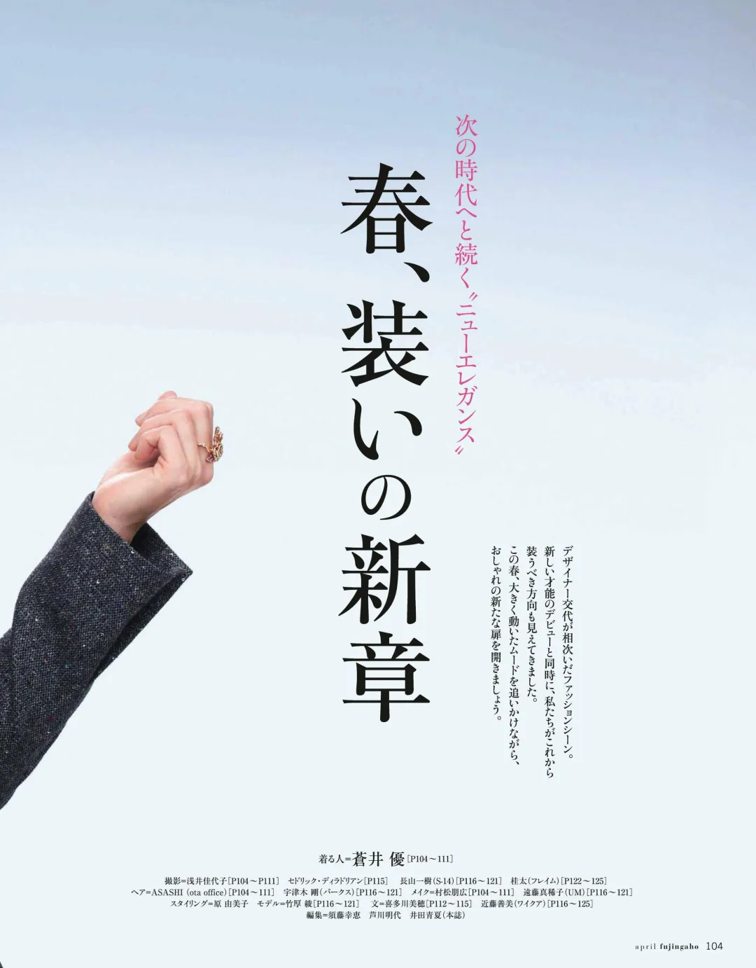 本期特辑以「次の時代へと続くニューエレガンス」(迈向新时代的新优雅) 为核心,苍井优化身时尚缪斯,演绎6大顶奢品牌由新生代设计师掌舵的2026春夏系列,用6套风格迥异的造型,诠释「新优雅」的多元内核——既有复古经典,也有先锋解构,完美适配春日穿搭的所有场景。
