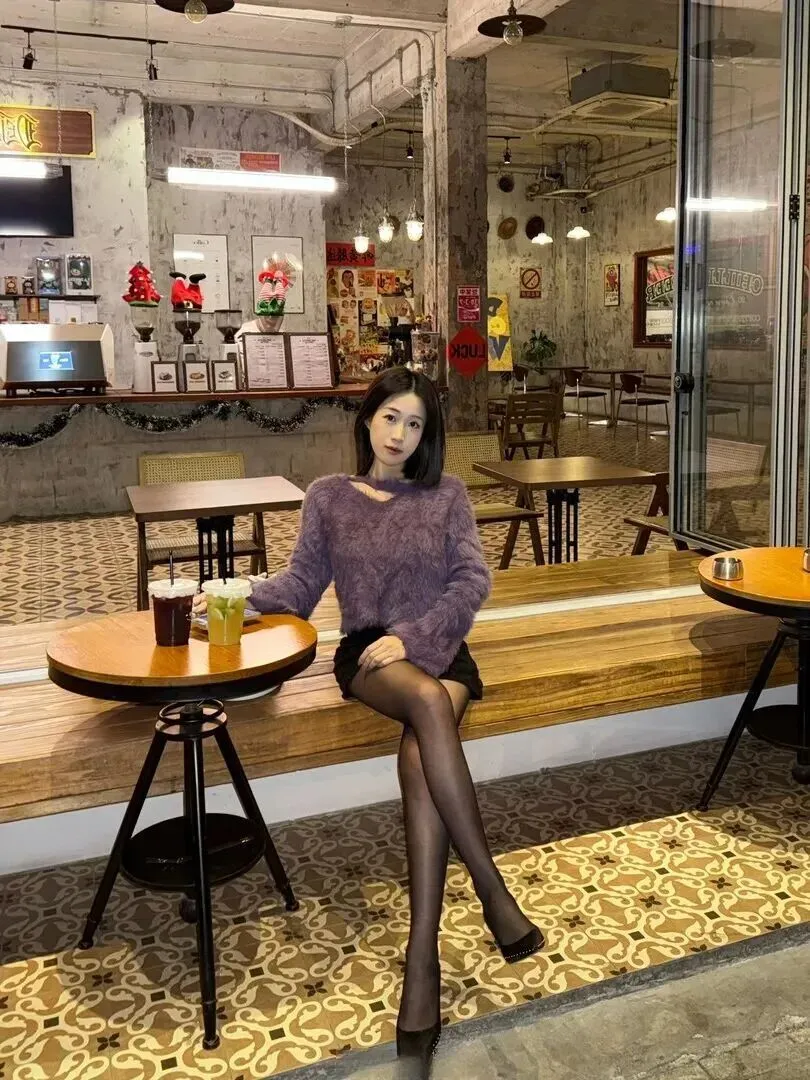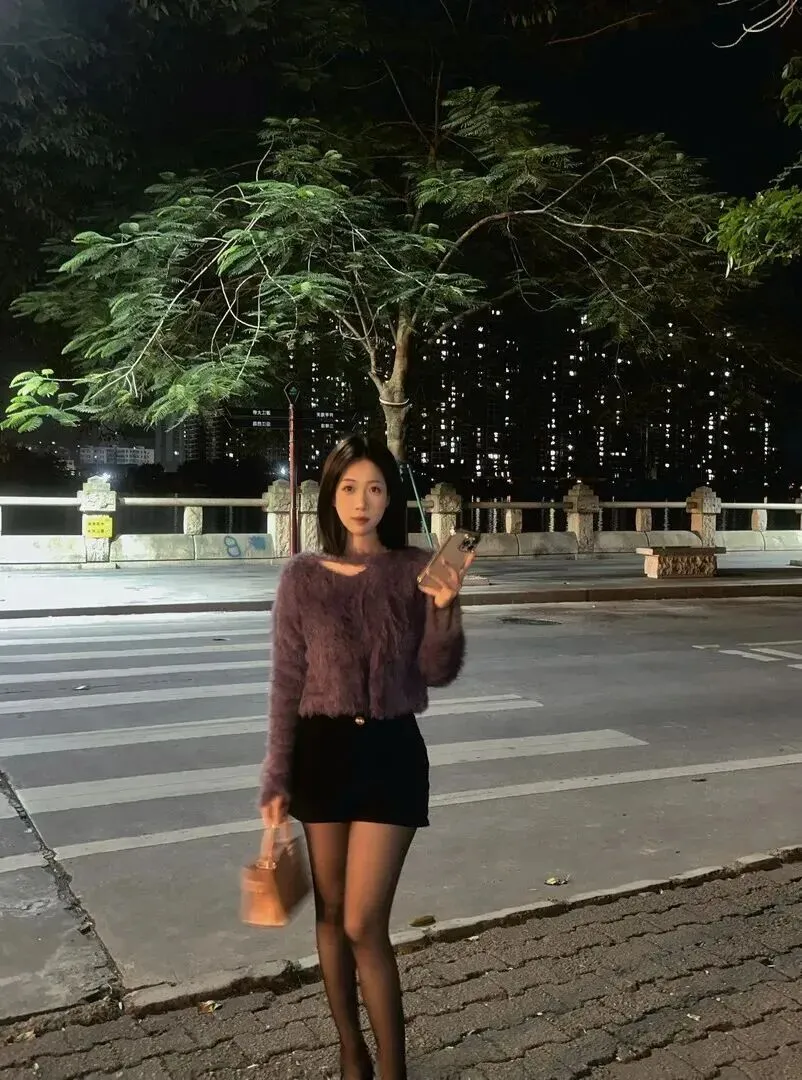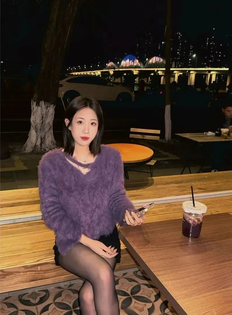 晚上穿什么穿什么!小姐穿了淡紫色仿水貂毛衣,V领设计使脖子变得细长,毛绒材质给人很强的艺术感。小小的破洞领口给单调的甜妹增添了一份清冷之感。在路灯的暖黄色光下穿上黑色短裤搭配透明的肉丝袜,温柔与性感相平衡。坐在街边的木台上,夜色就是最美的背景,氛围感十足!