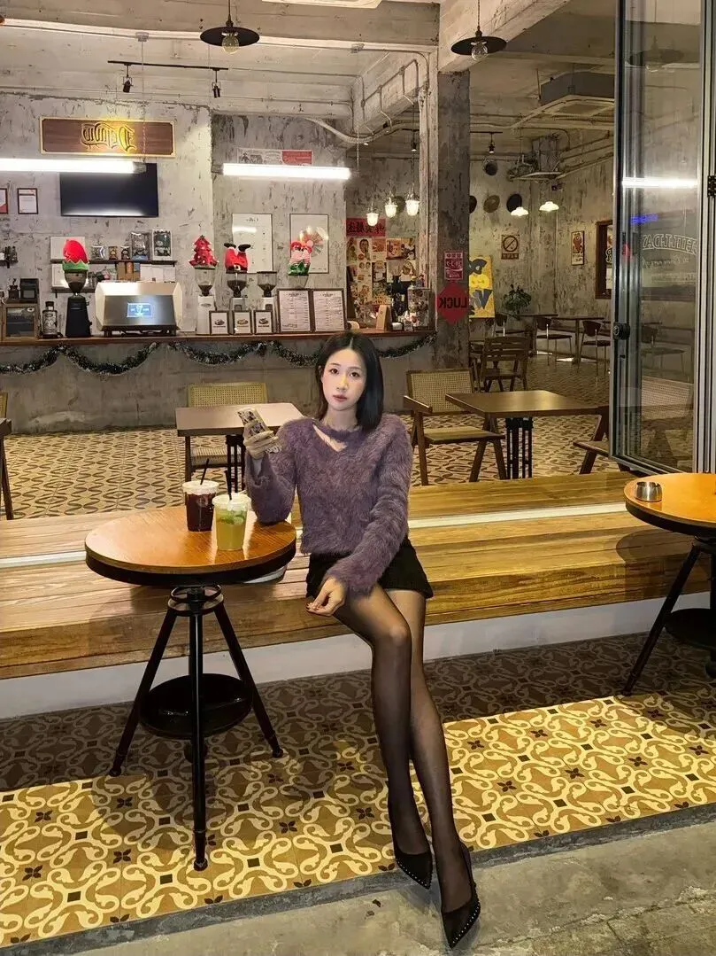 于温暖的阳光当中,在一间充满古风的咖啡店里,品一口香醇的拿铁咖啡。这个小姐姐选了浅紫色的短款毛绒毛衣,柔软的质地一摸就感觉特别舒服!领口处一个小洞,不经意间露出锁骨的位置上,有点小心机的意味。下身是黑色紧身短裤加薄丝袜,甜中带酷的风格瞬间就被拉出来。脚穿一双双头小低跟的鞋,走路拖拖沓沓地不注意。坐在木制的旧长椅上,灯光洒下来,整个人就像电影里的女主角,随便拍都好看!