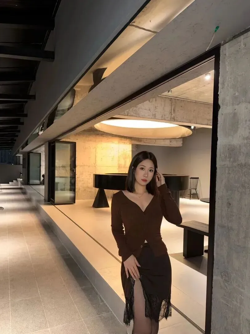 蕾丝+深棕色,撞出不一样的火花,修腰开衫加高开叉蕾丝裙既淑女又含有一丝丝的小性感。小姐姐举上来的那一瞬就是柔柔而有刚强感的完美结合,背景里冰冷坚硬和温暖柔情的结合显得格外突出。