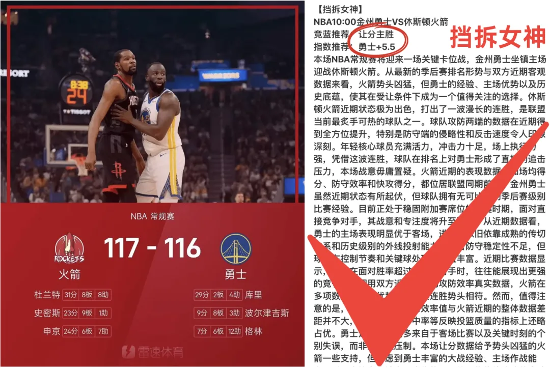 今日【挡拆女神】,精选了勇士116-117火箭。最值得咱们出手的一场比赛,已然浮出水面。