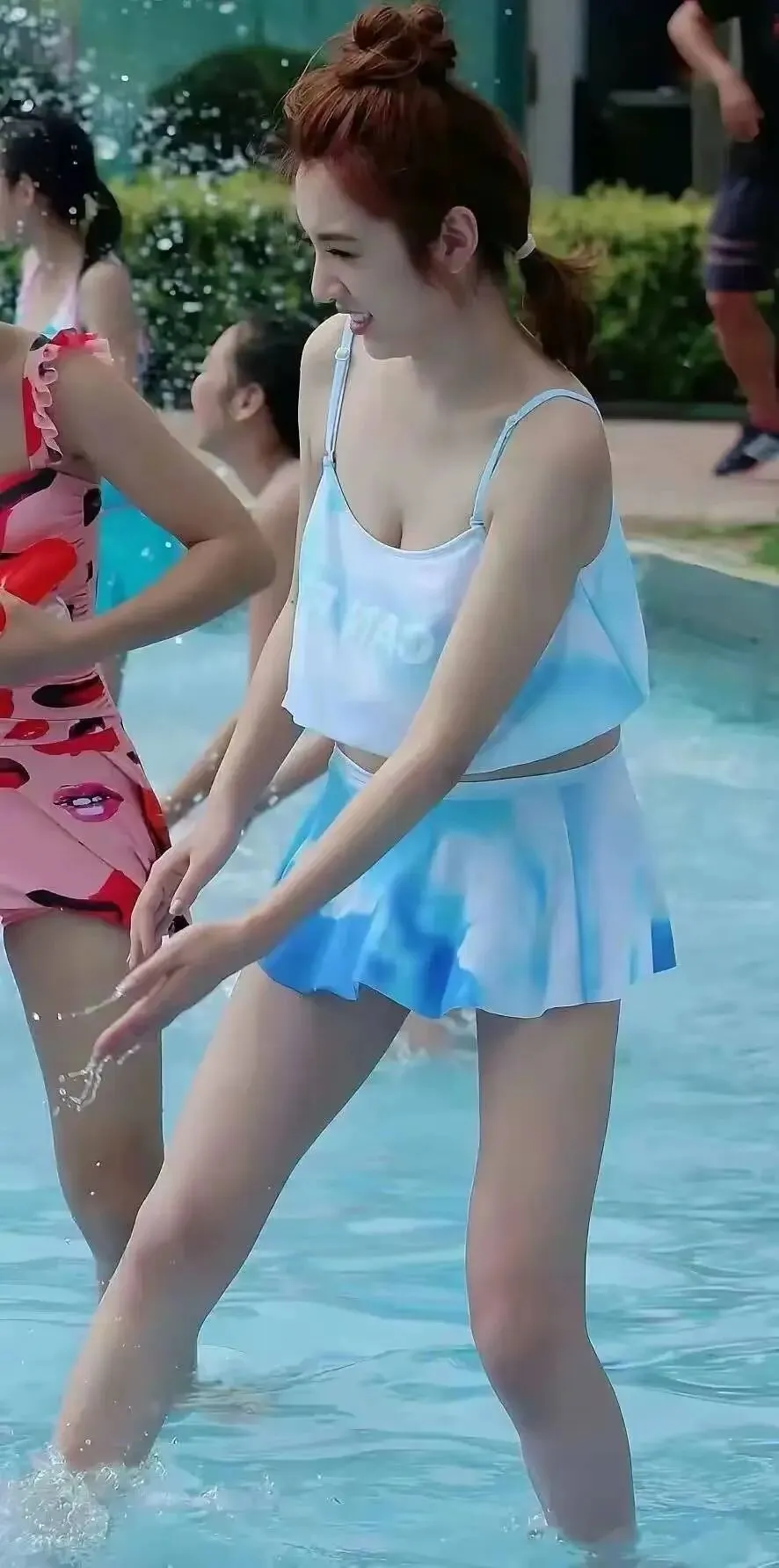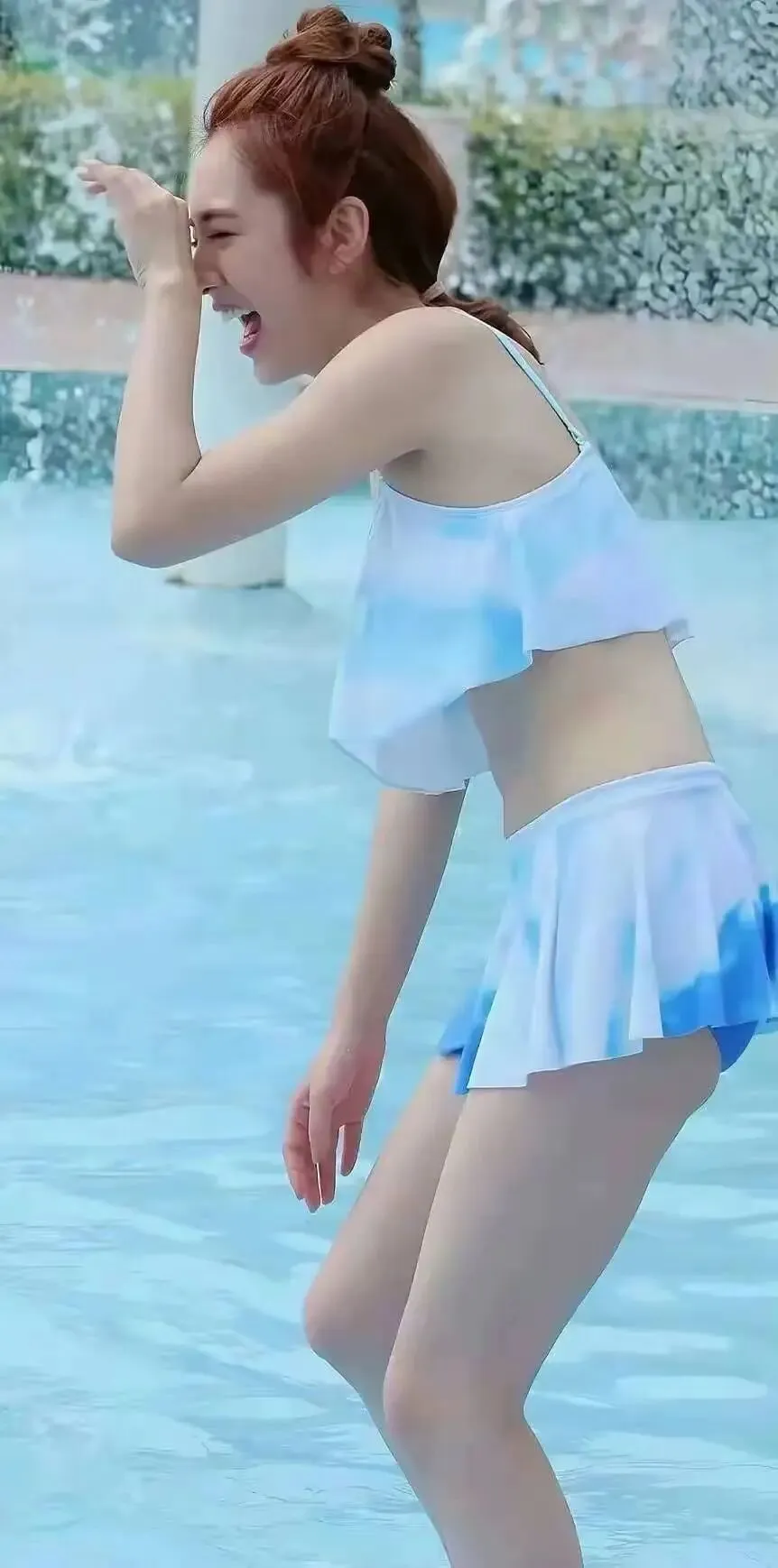 重点来了,她身上那套蓝白晕染的分体泳装,选得是相当巧妙。荷叶边的小吊带,加上百褶裙式的下装,这套路,高啊!既完美藏住了可能的一点点“幸福肉”,又把最纤细的腰肢和那双笔直修长的“漫画腿”大大方方地秀了出来。清新、甜美,还带着点小性感,这尺度拿捏得,绝了!