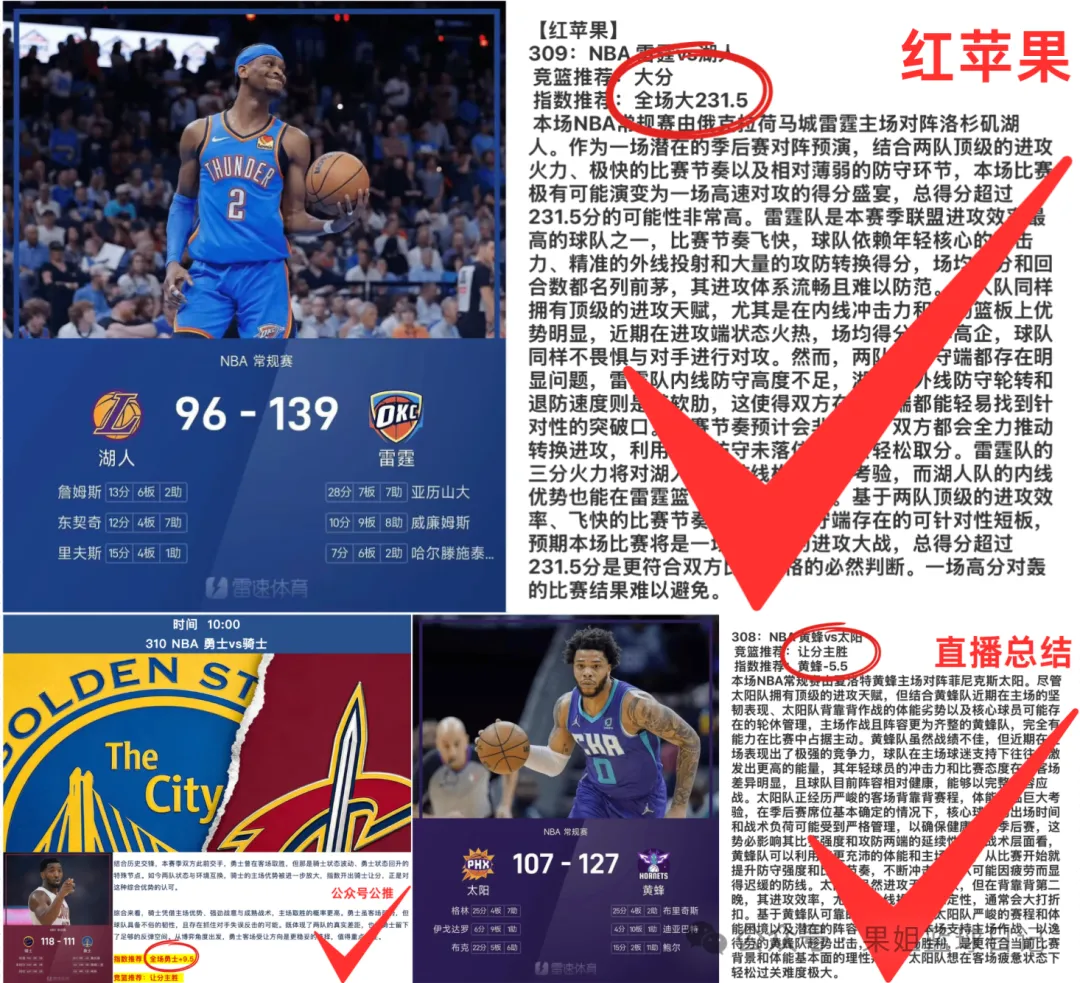 今天果姐给兄弟们带来4场 NBA 精选直播间分享,观点果姐会在总结更新在下方的总结里面,长按识别查看!