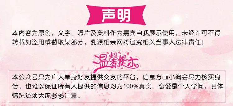 本平台属于开放性公益平台,凡向本微信平台或工作人员发送个人征婚信息,均视为同意将其个人信息通过本微信平台对外发布,由此而产生的后果由本人承担;