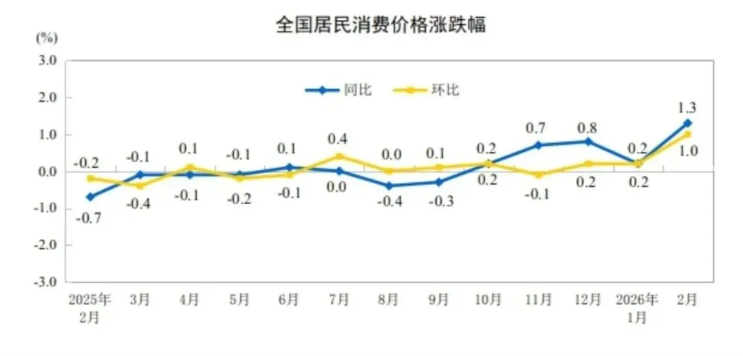 CPI:同比 1.3%,环比+1.0%