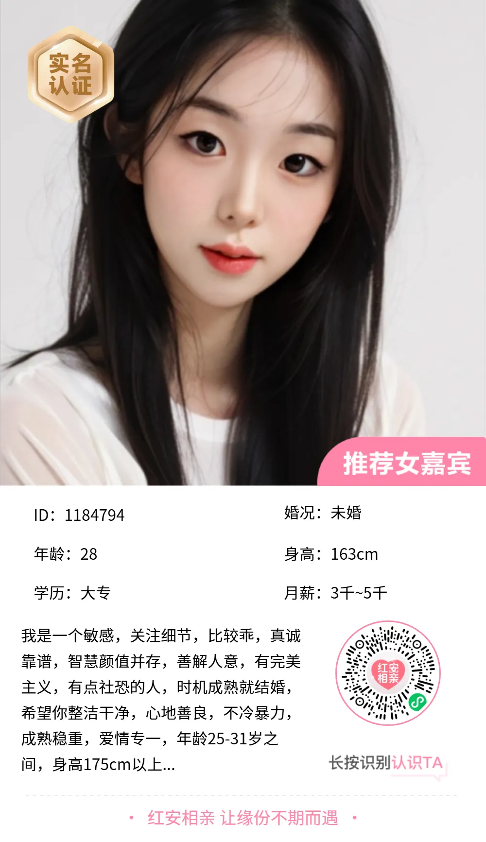 tip:上墙嘉宾均为红安相亲小程序注册用户,如果你想认识ta可以添加红娘微信,回复嘉宾ID号,红娘一对一牵线~