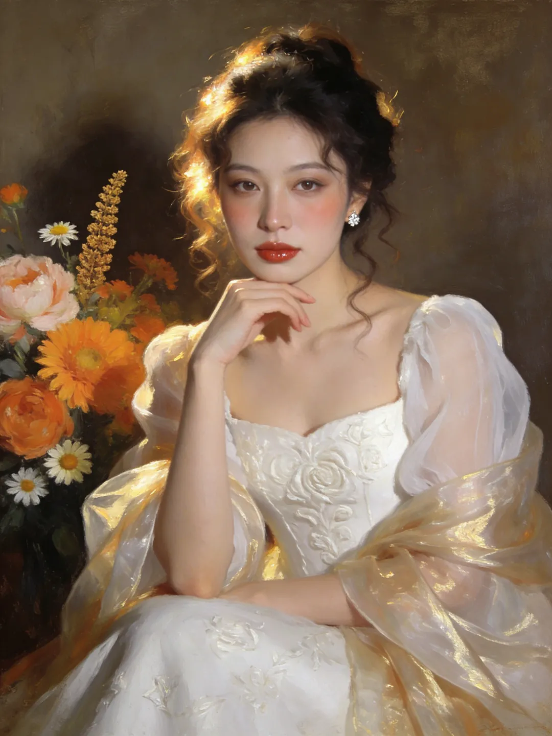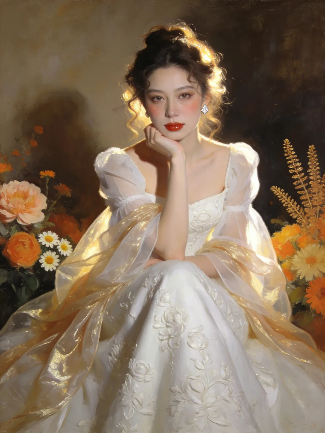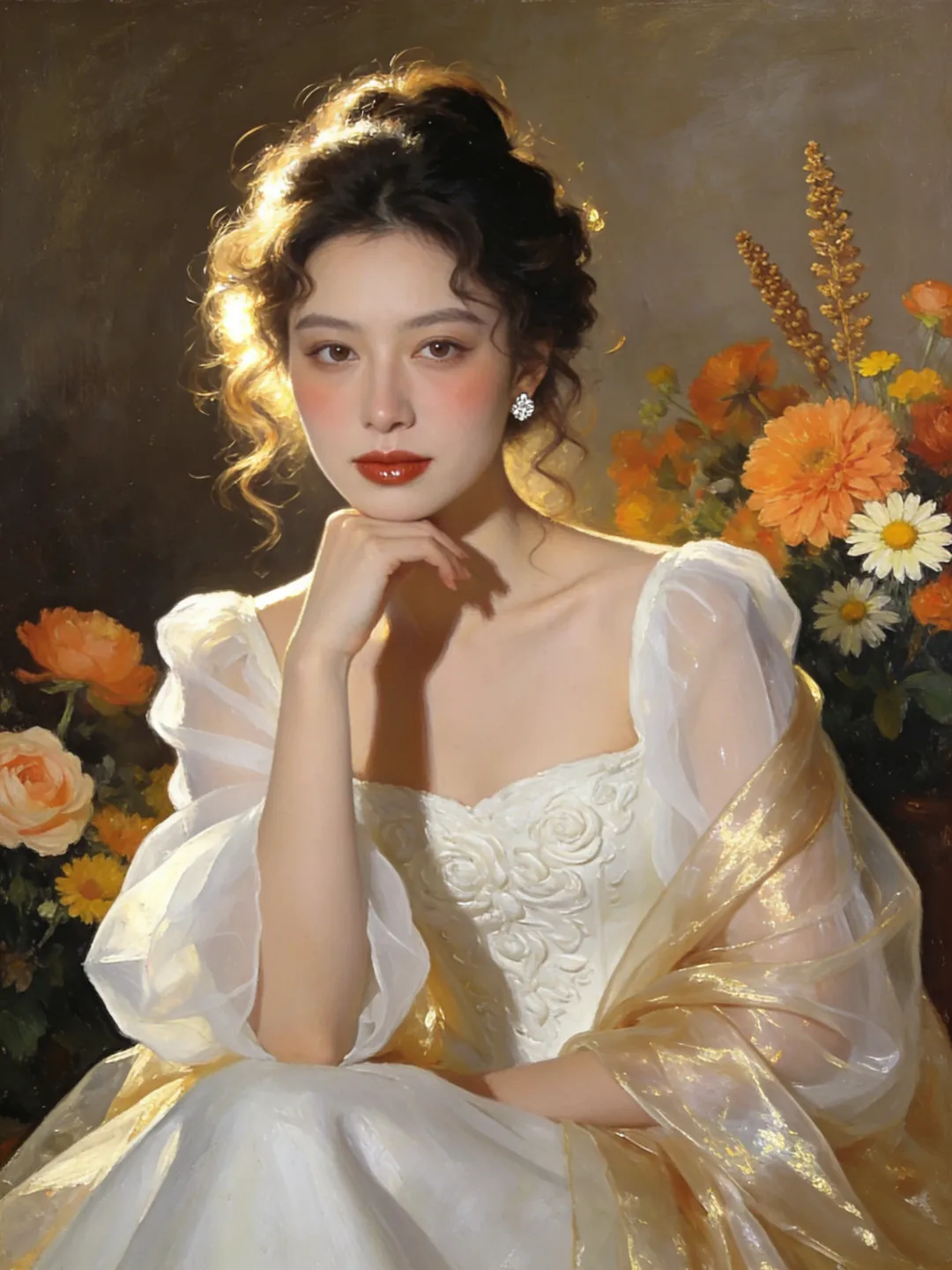 提示词:帮我生成6张油画风格人像写真,每张图片一个动作姿势和构图,全身,半身,特写,单人正坐,直视镜头,姿态优雅慵懒,身体微微倾向镜头,单手轻托下巴,整体气质温婉高级,风格统一