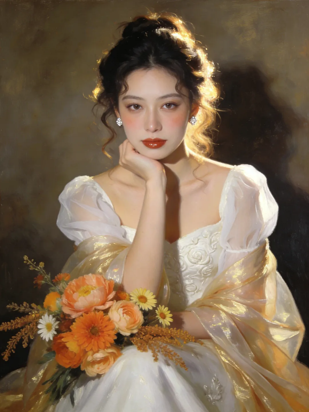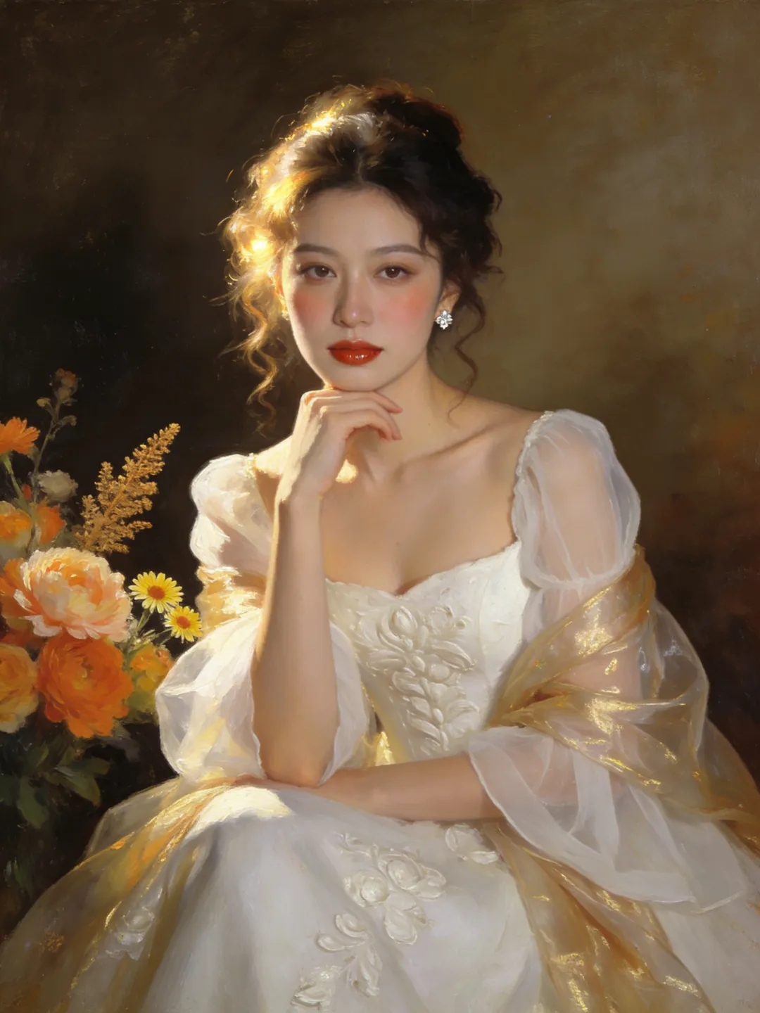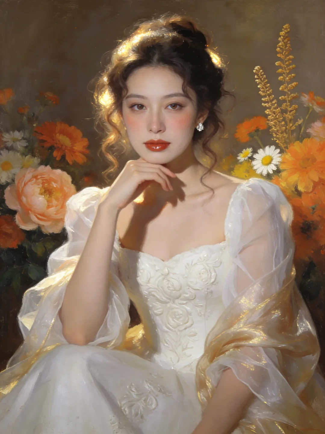 提示词:帮我生成6张油画风格人像写真,每张图片一个动作姿势和构图,全身,半身,特写,单人正坐,直视镜头,姿态优雅慵懒,身体微微倾向镜头,单手轻托下巴,整体气质温婉高级,风格统一