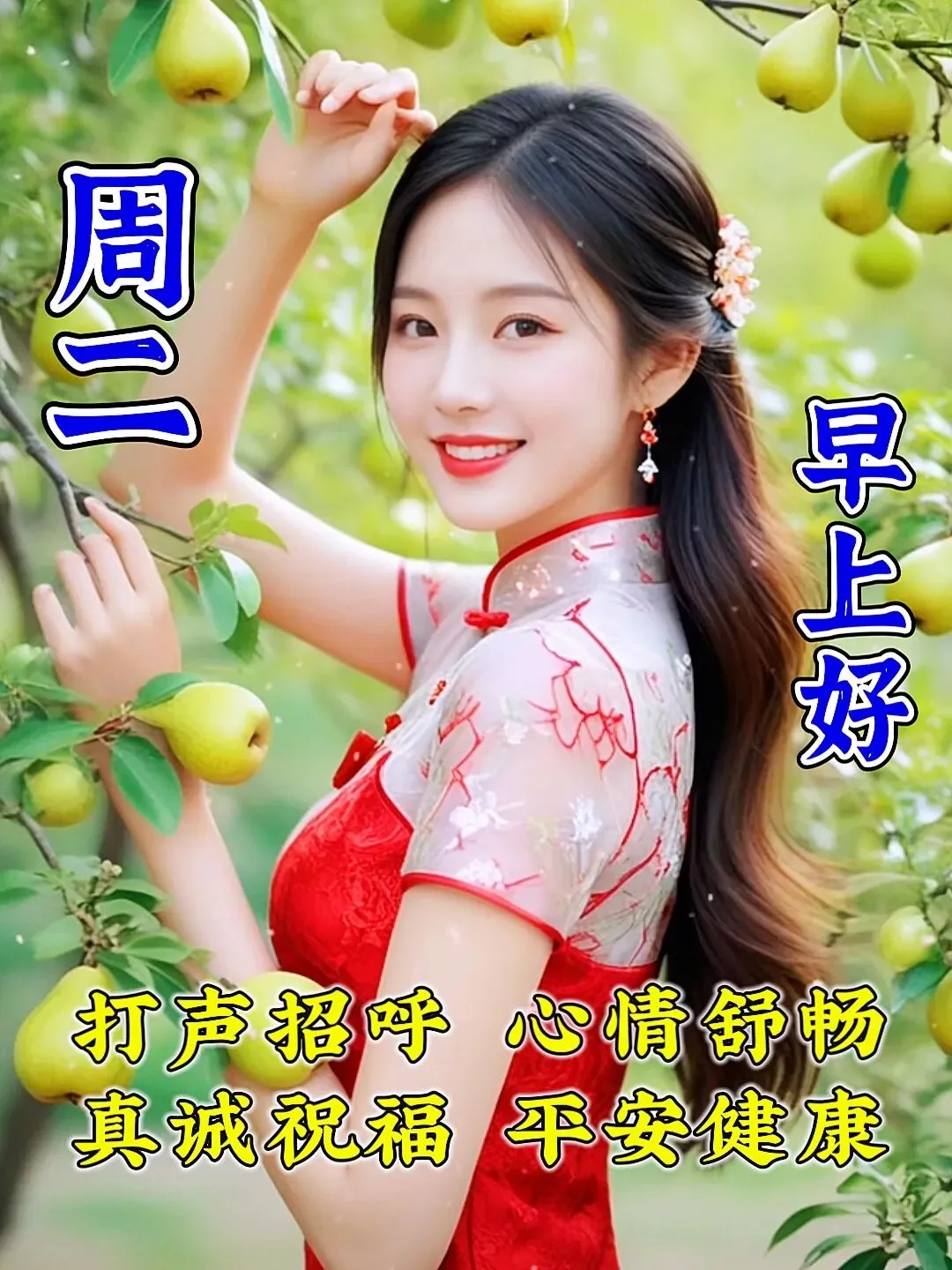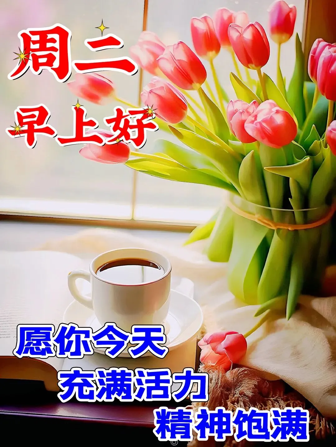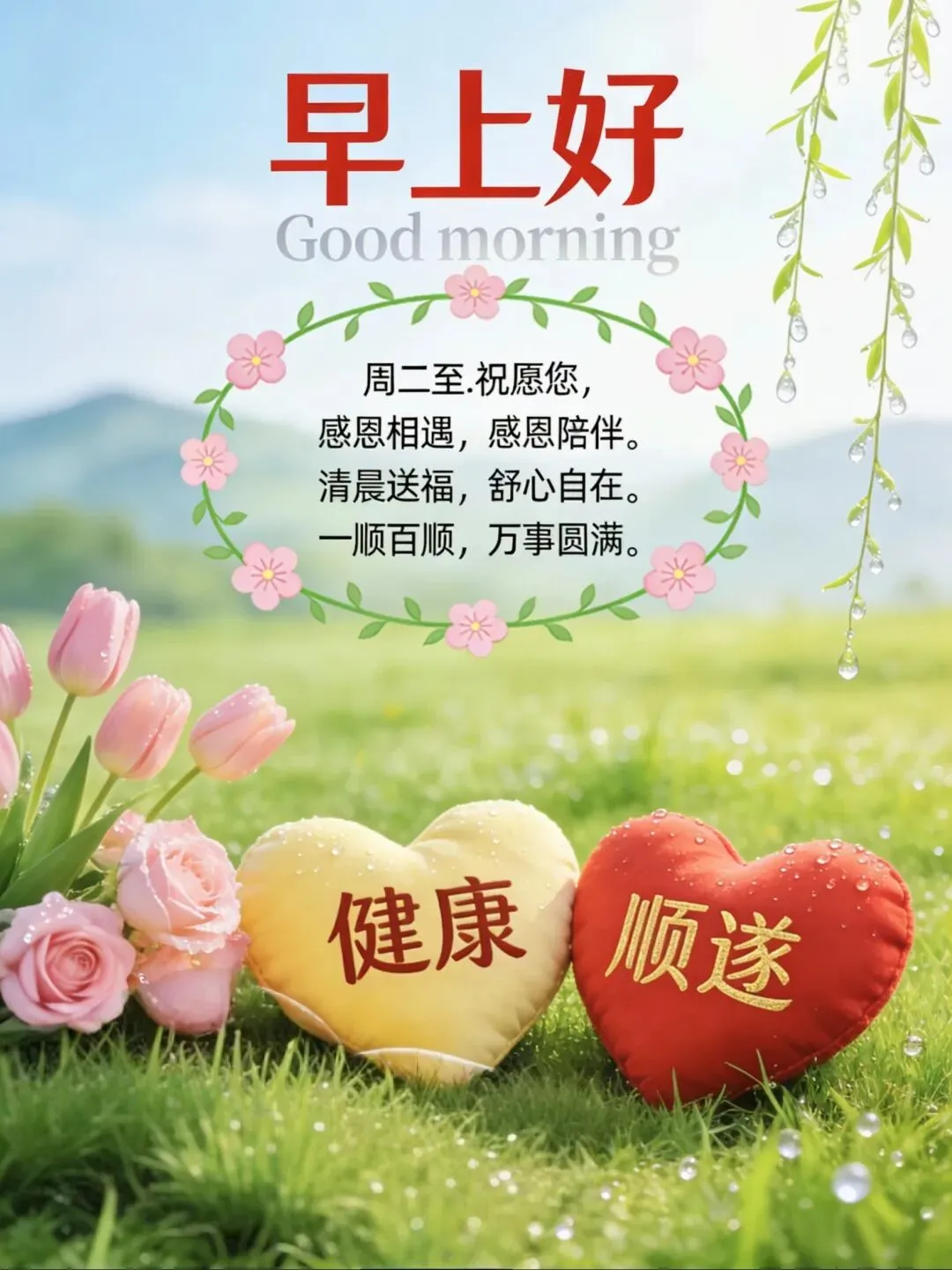 ☀️😊🎉周二早上好!愿你晨起有喜,心有清欢。轻轻为你送上一份祝福,愿它伴你朝朝暮暮,赐你健康顺遂、好运常伴、幸福满怀,度过温柔而美好的一天。🌿💖🙏