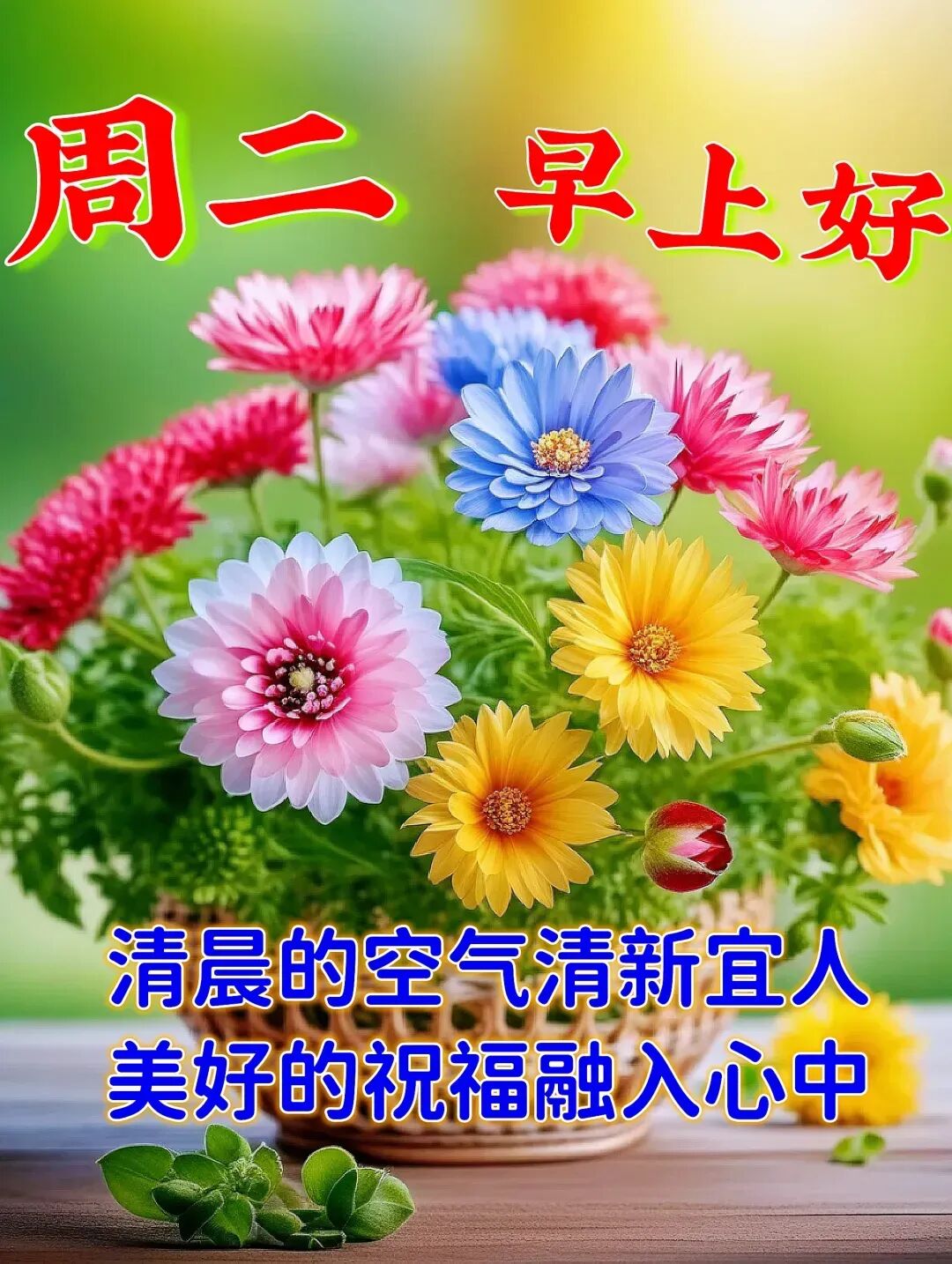 🌞清晨的阳光灿烂无比,💖我的问候温暖无比,🍀新的一天快乐无比。🌅一份美好的祝福,🍁送给朋友,愿你有个快乐的今天,🌹有个美好的明天,💧健康平安每一天!💖 周二愉快!🌷