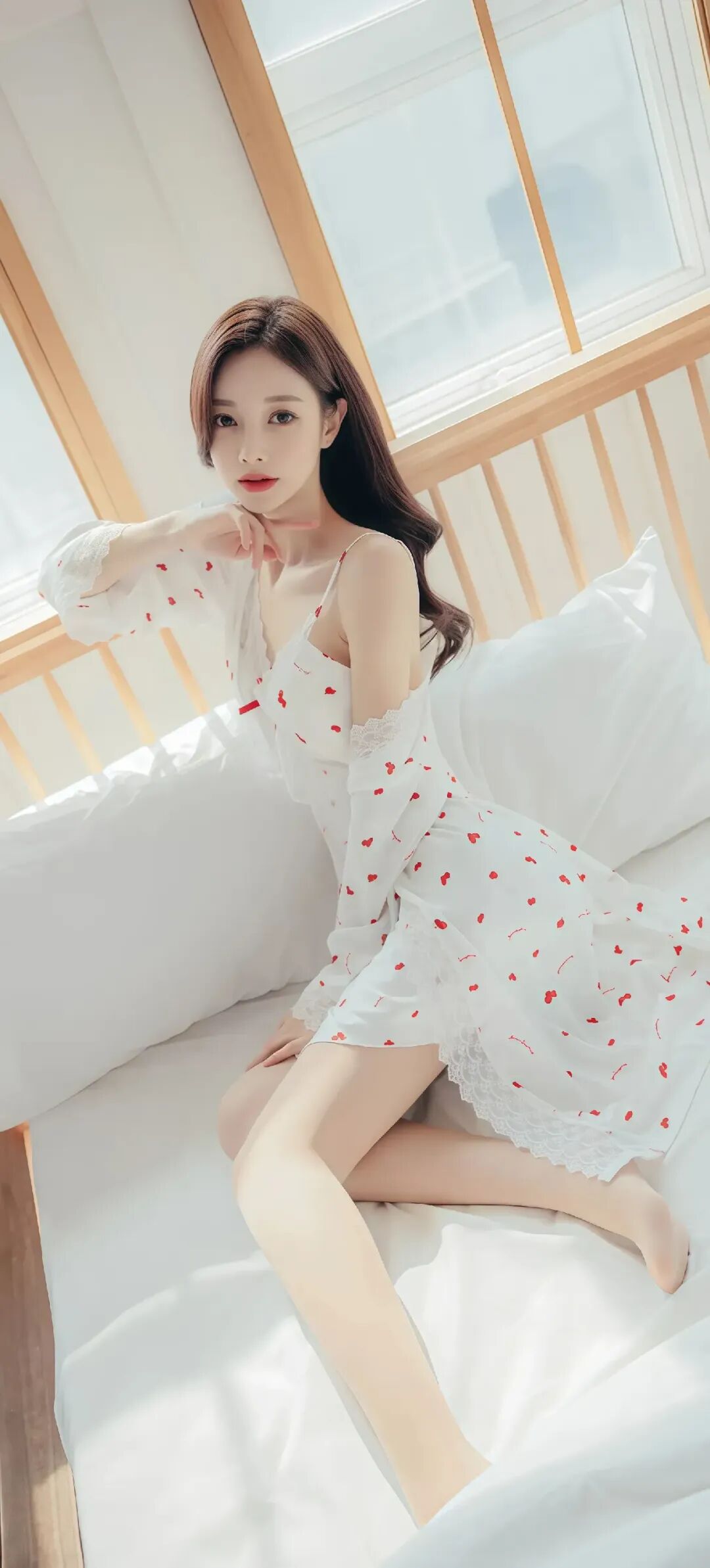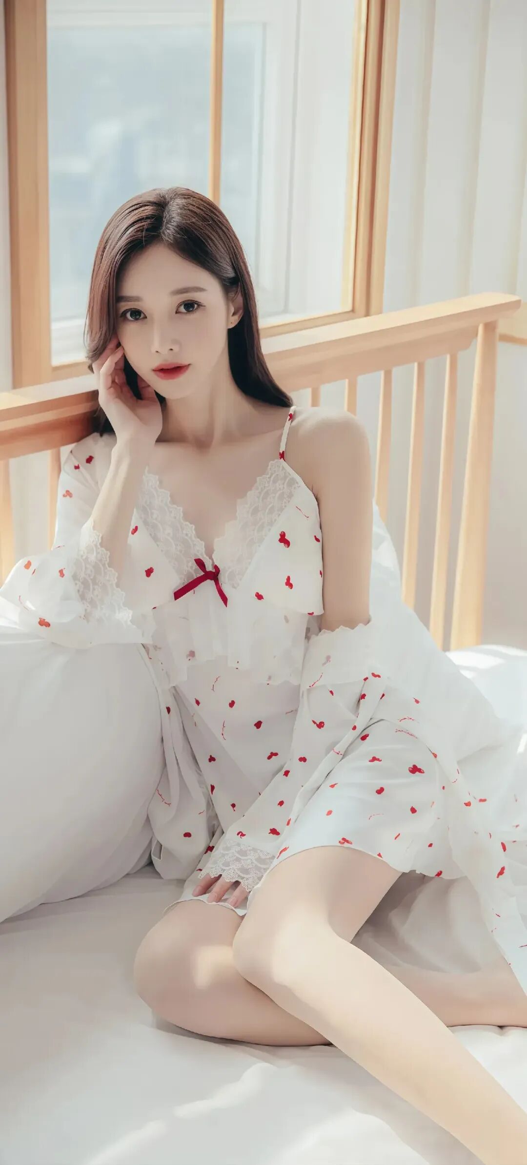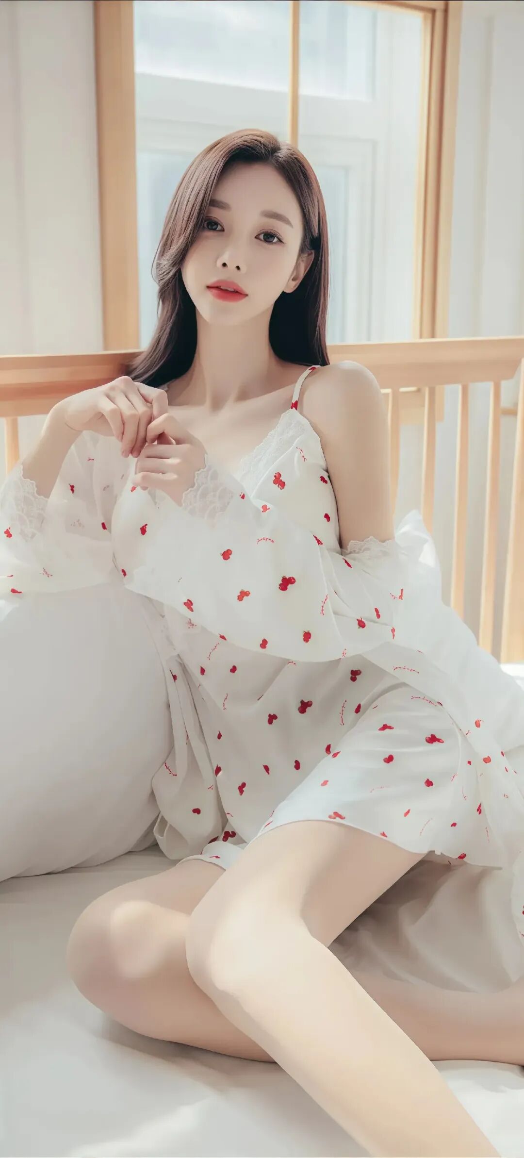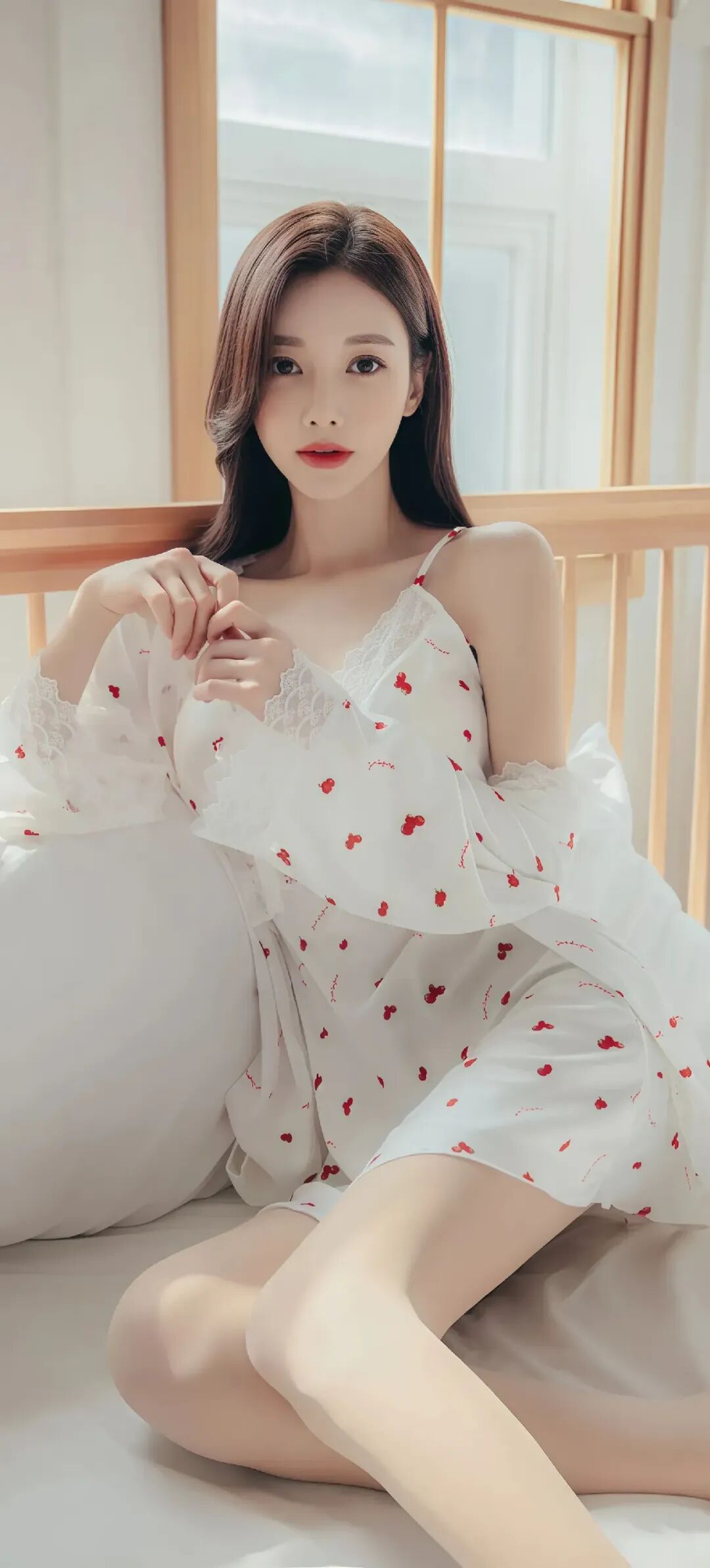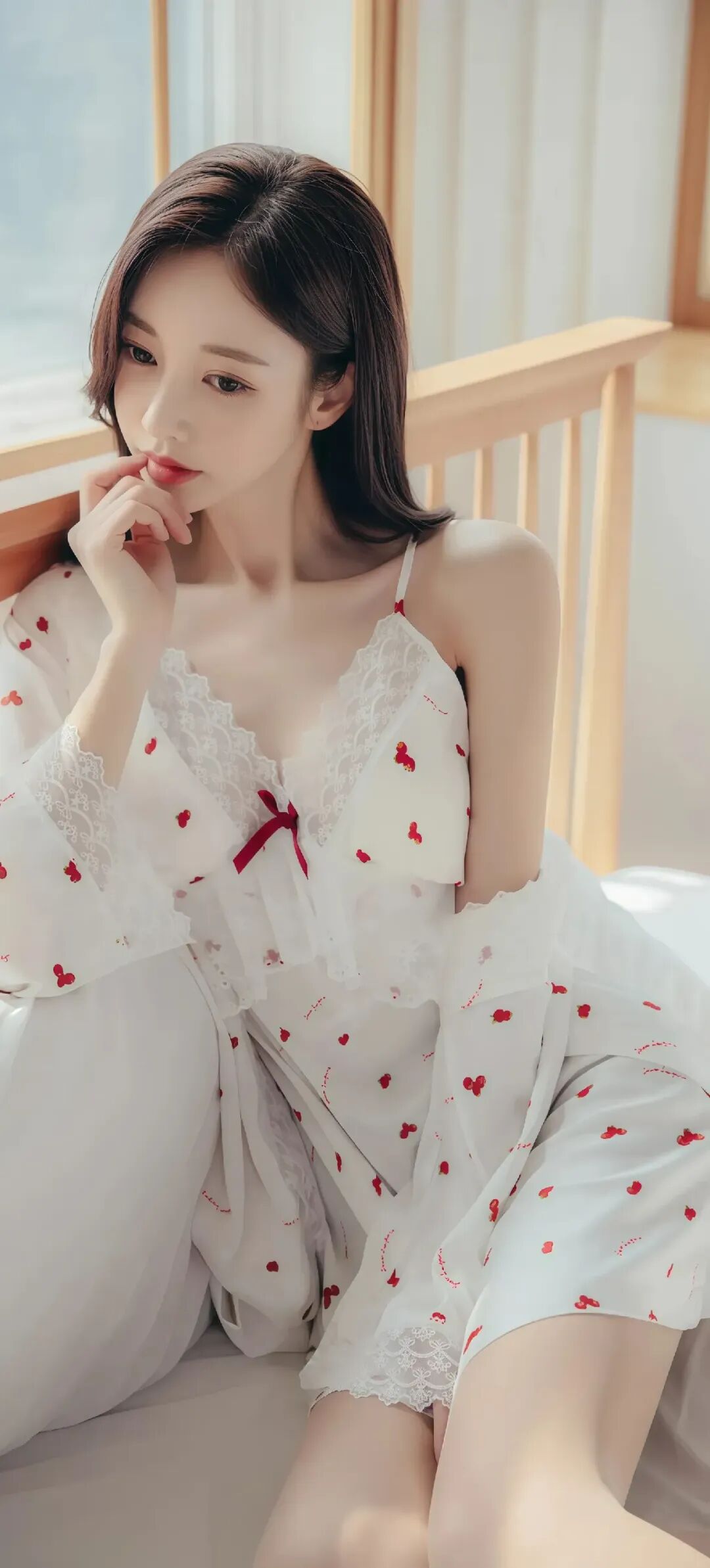 当前位置:首页>美女资讯>美女模特孙允珠温柔甜美的少女,穿着红色草莓图案的白色睡衣,坐在舒适的床上,散发着温馨的气息