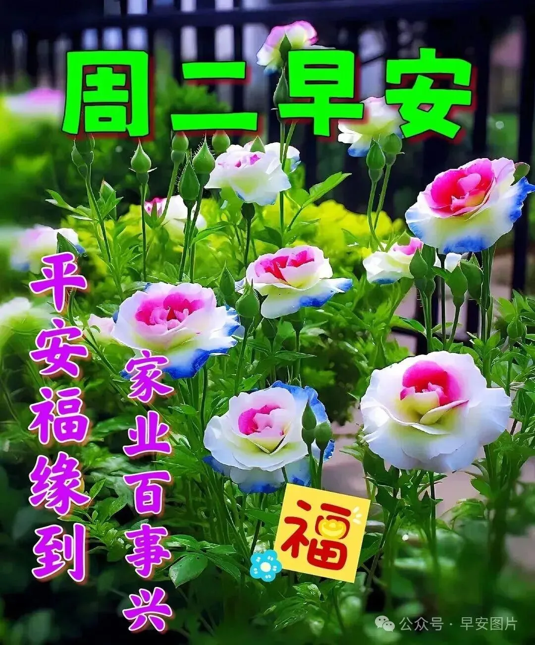 🌸清晨阳光照在身,🍎祝你幸福又平安;🍉清晨微风吹你脸,🌸祝你梦想早实现;🌅清晨短信祝福你,🍒祝你开心每一天,🌻周二早安!💐