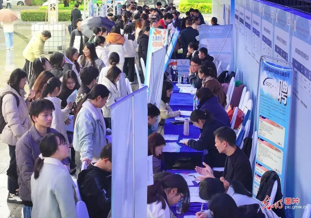 3月28日,湖南省衡阳市2026年全国城市联合招聘高校毕业生春季专场活动暨“万雁入衡”引才双选会在南华大学举行,来自全国的203家单位带着8236个用人岗位在这里设点供需见面洽谈,助力高校毕业生就业。图为当日,在位于衡阳市的南华大学广场,求职人员与招聘工作人员进行交流洽谈。