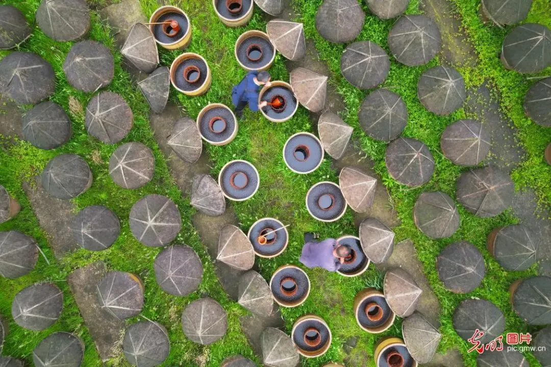 近年来,贵州省赤水市大力挖掘和培育乡土人才,传承晒醋古老技艺,并通过“线上+线下”拓宽销售渠道,让产品深受消费者青睐。图为3月30日,在赤水市天台镇一家晒醋厂内,非遗传承人在检查晾晒的醋坛。