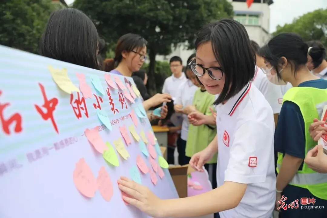 湖南省永州市道县第一中学,学生将写好的“小美好”贴在展板上。