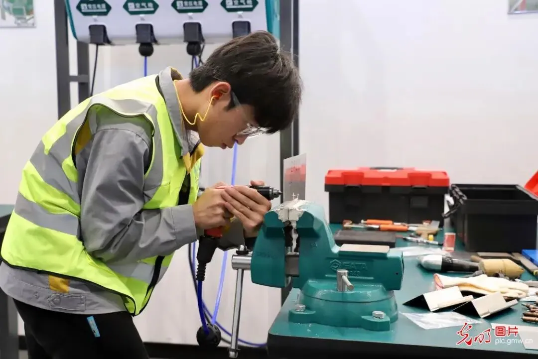 在第二届山东省职业技能大赛上,参赛选手进行飞机维修项目比赛。