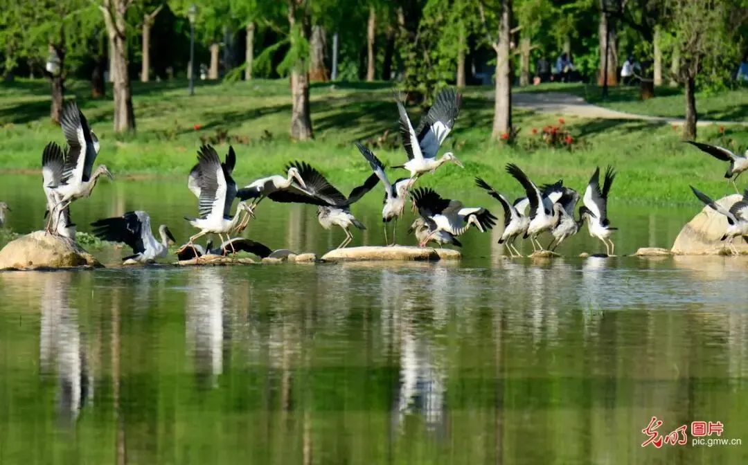 3月30日,云南省红河哈尼族彝族自治州弥勒市甸溪河湿地公园,河畅、水清、岸绿,吸引钳嘴鹳在此觅食、嬉戏,构成一幅优美的生态画卷。