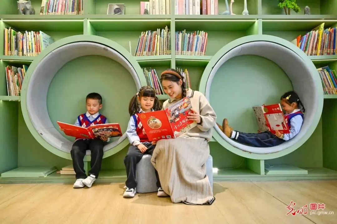 3月31日,安徽合肥,幼儿园小朋友在老师的指导下阅读绘本。