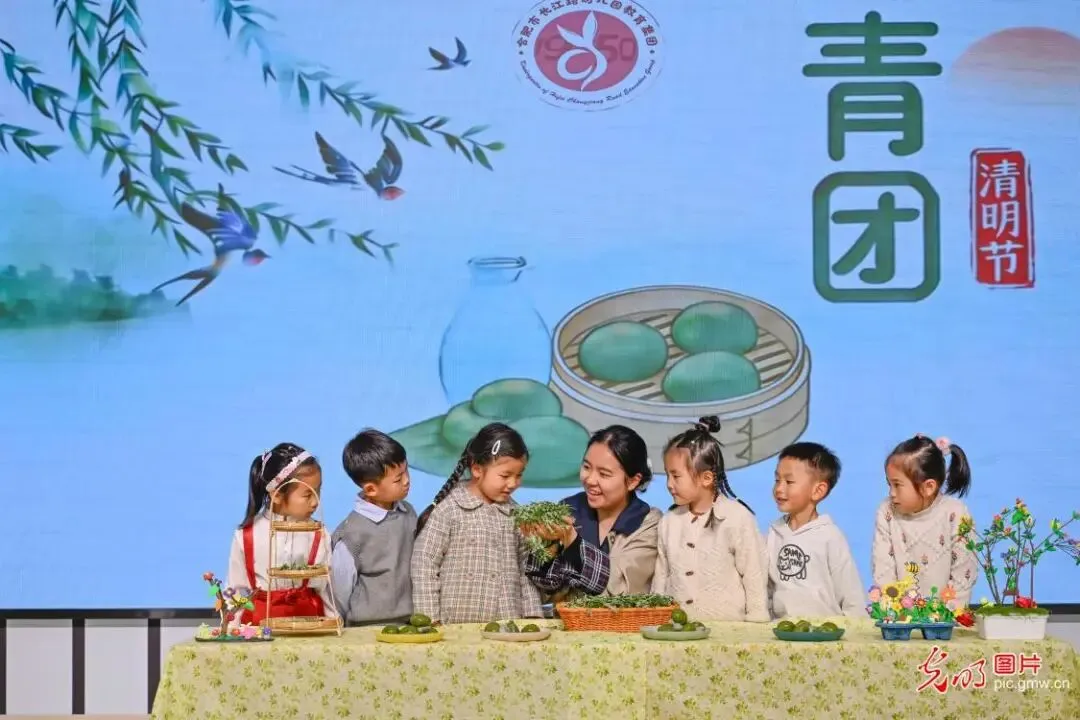 4月2日,安徽省合肥市长江路幼儿园教育集团淮北路分园举行“做青团,知民俗”清明节传统文化体验活动。孩子们通过体验传统民俗,感受中国传统文化的魅力。图为小朋友们正在学习制作青团。