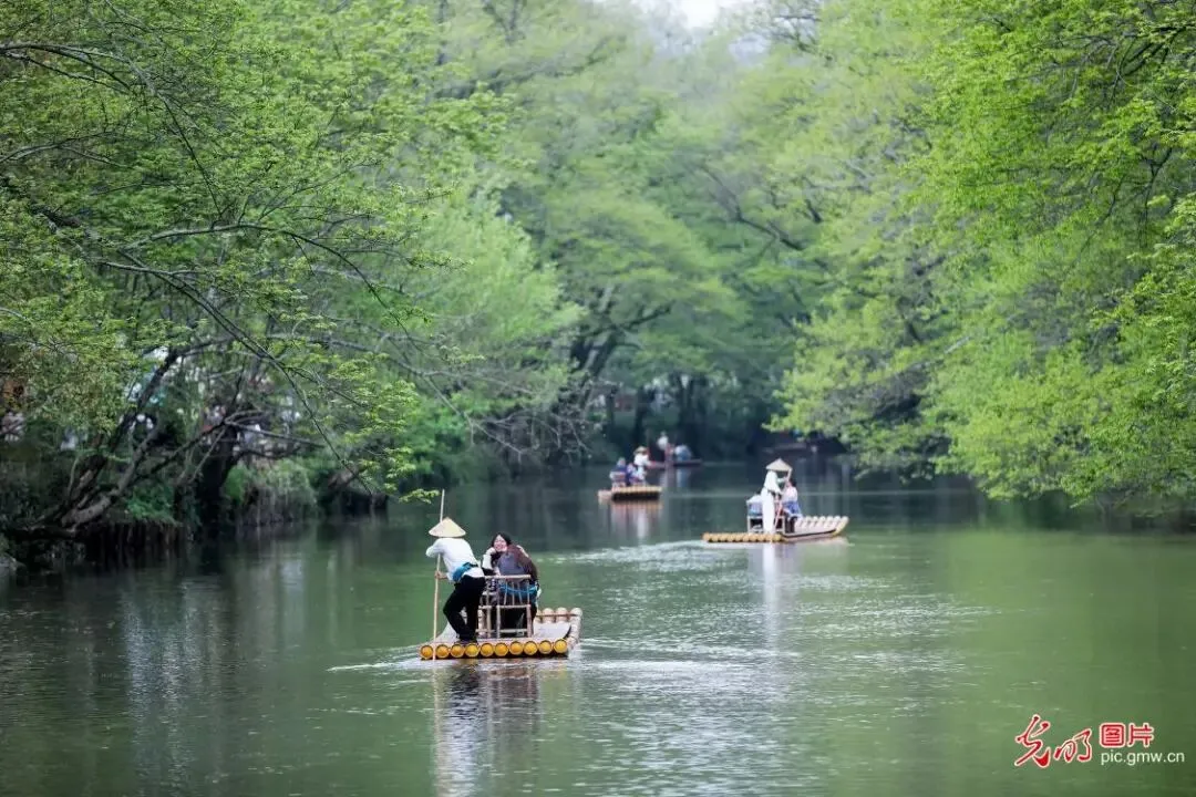 4月4日,安徽省黄山市徽州区西溪南湿地春意盎然,吸引众多市民和游客前来踏青游玩,乐享惬意时光。