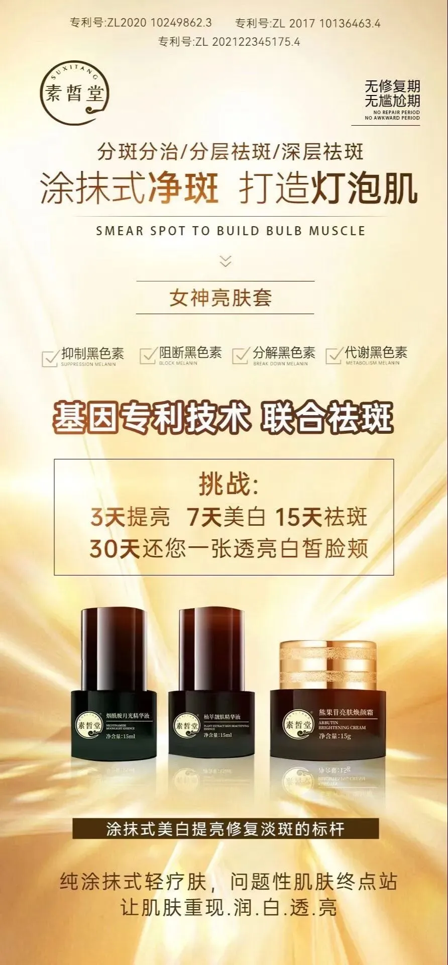 素皙堂女神亮肤套,依托基因专利技术,打造涂抹式净斑 “黑科技”。秉持 “分斑分治、分层祛斑、深层祛斑” 理念,从黑色素全链路入手:先抑制其生成,切断色斑源头;再阻断传递,不让色素沉积;接着分解已形成的黑色素,加速代谢排出。无需修复期、尴尬期,纯涂抹轻疗肤,适配问题性肌肤 。
