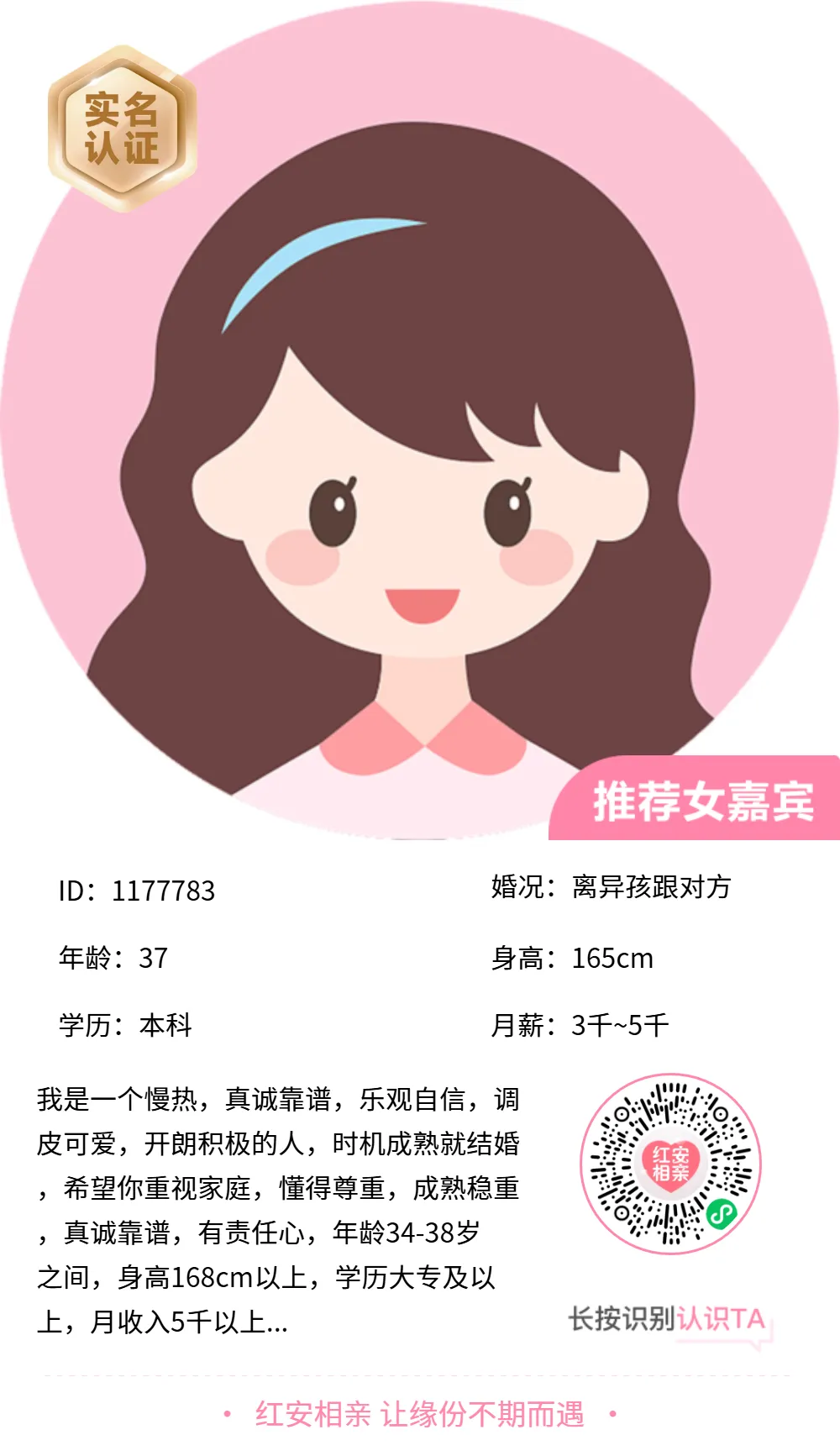 添加红娘微信,回复本期嘉宾ID,红娘一对一牵线,进入“红安相亲小程序”搜索嘉宾ID也可查看更多嘉宾资料。