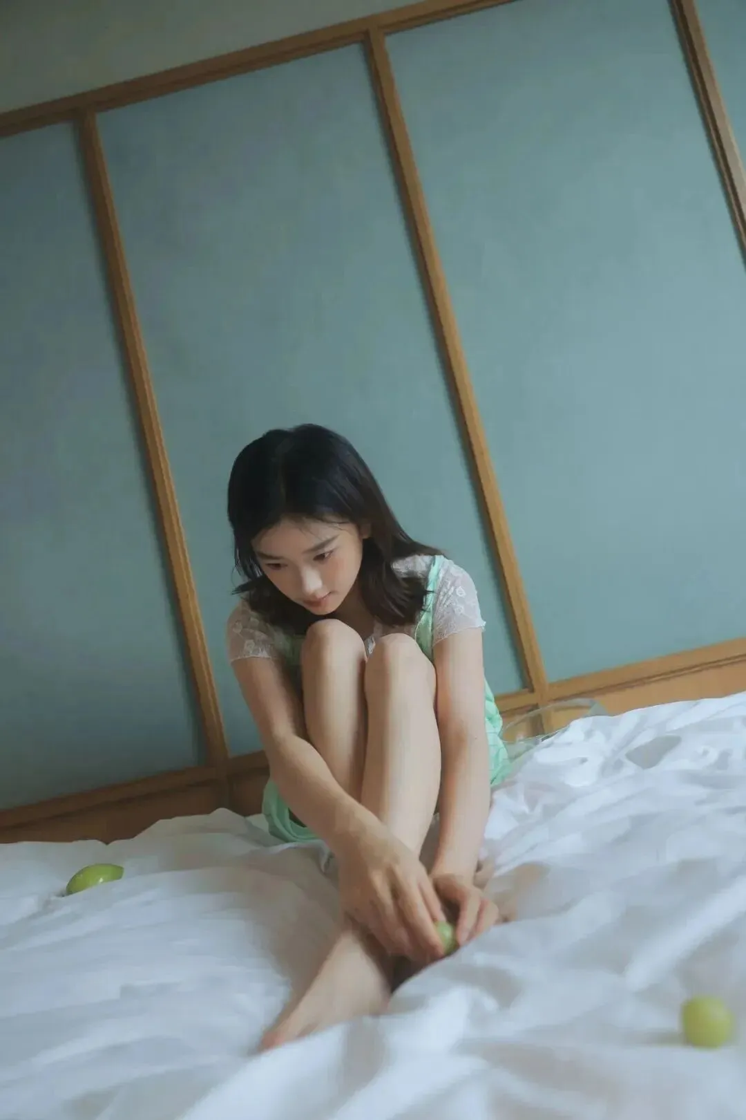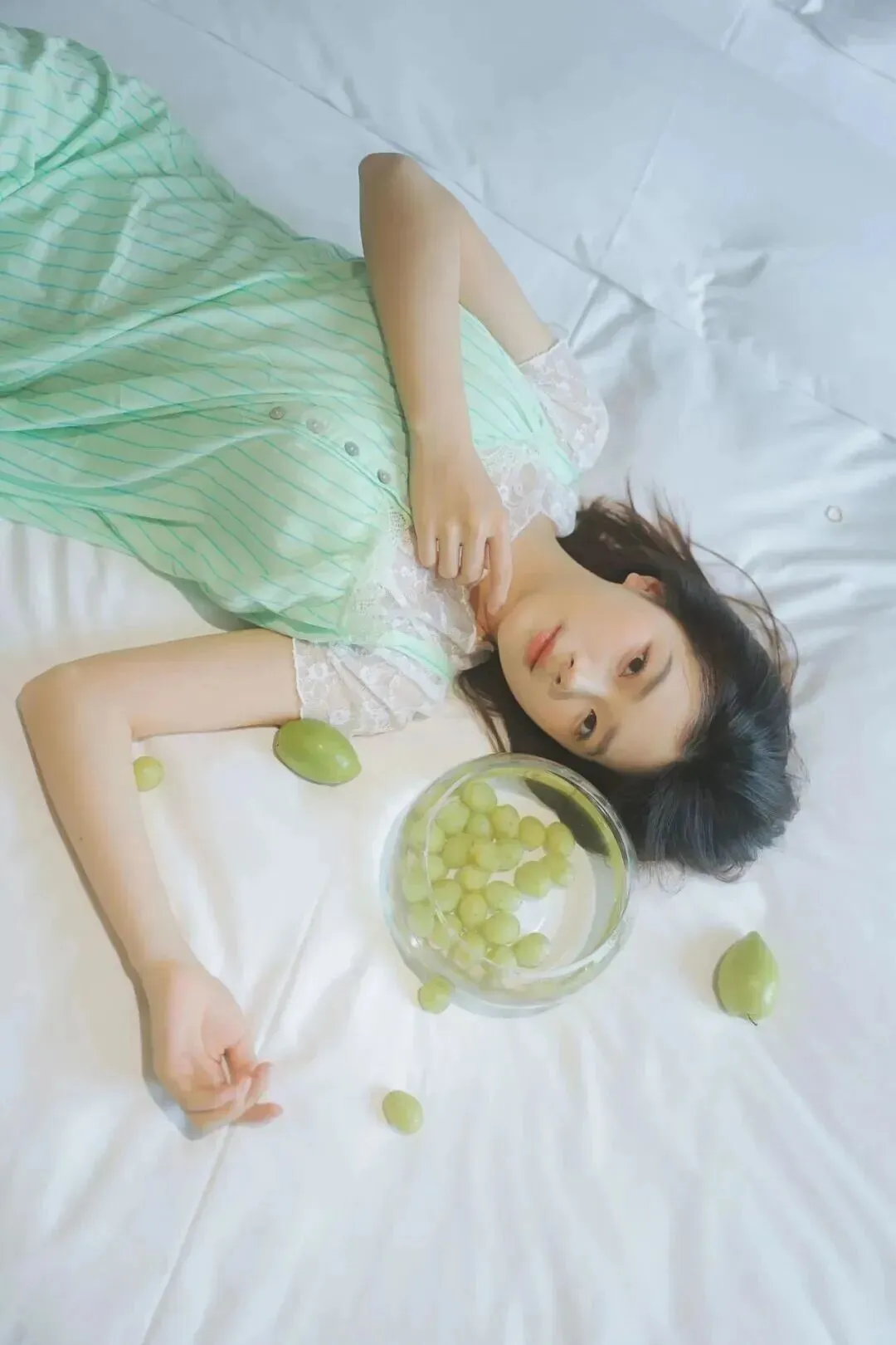 首先说说穿搭和道具。这次我选了一件浅绿色的连衣裙,这种低饱和度的绿色真的超级显白,自带一种清凉感,视觉上就能降温好几度。道具也不用特意去买,家里冰箱里的青葡萄就是最好的道具。绿色的葡萄和裙子颜色呼应,画面整体色调统一,看起来特别舒服干净。背景就是普通的白色床单,白色是天然的反光板,能让皮肤看起来通透有光泽,整个人像是发了光一样。