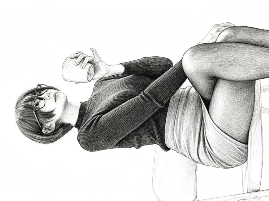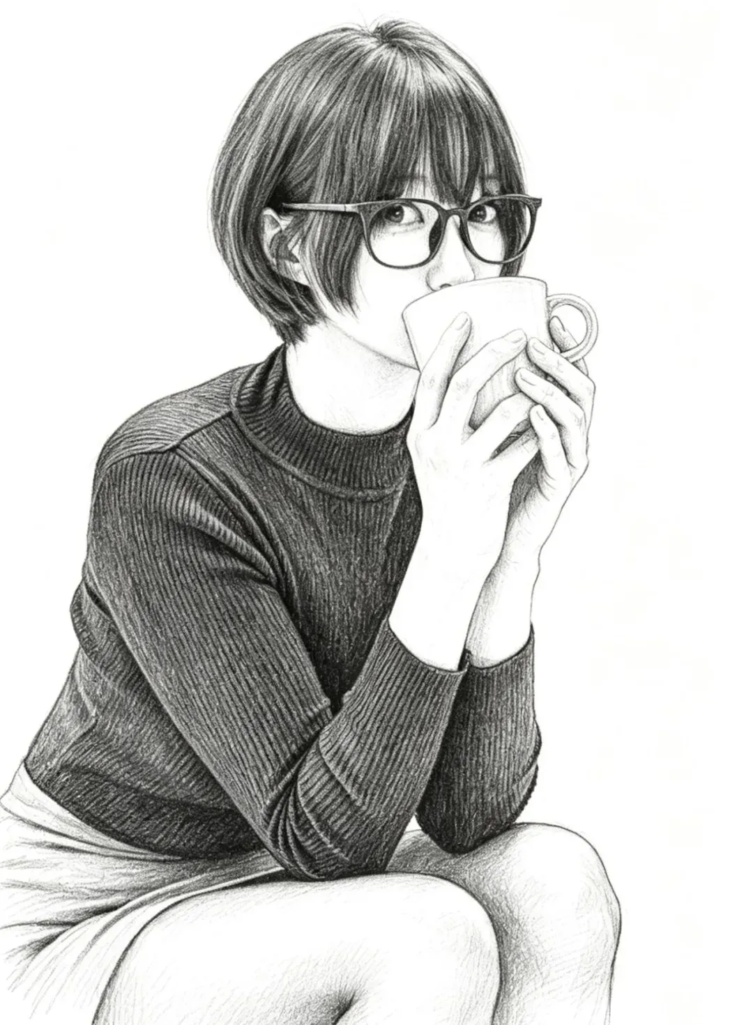 • 细节亮点:人物五官刻画清晰,黑框眼镜的轮廓、短发的层次分明;针织衫的纹理在特写中更具质感,手部结构精准;纯白背景完全突出人物,视觉焦点集中在神态上。