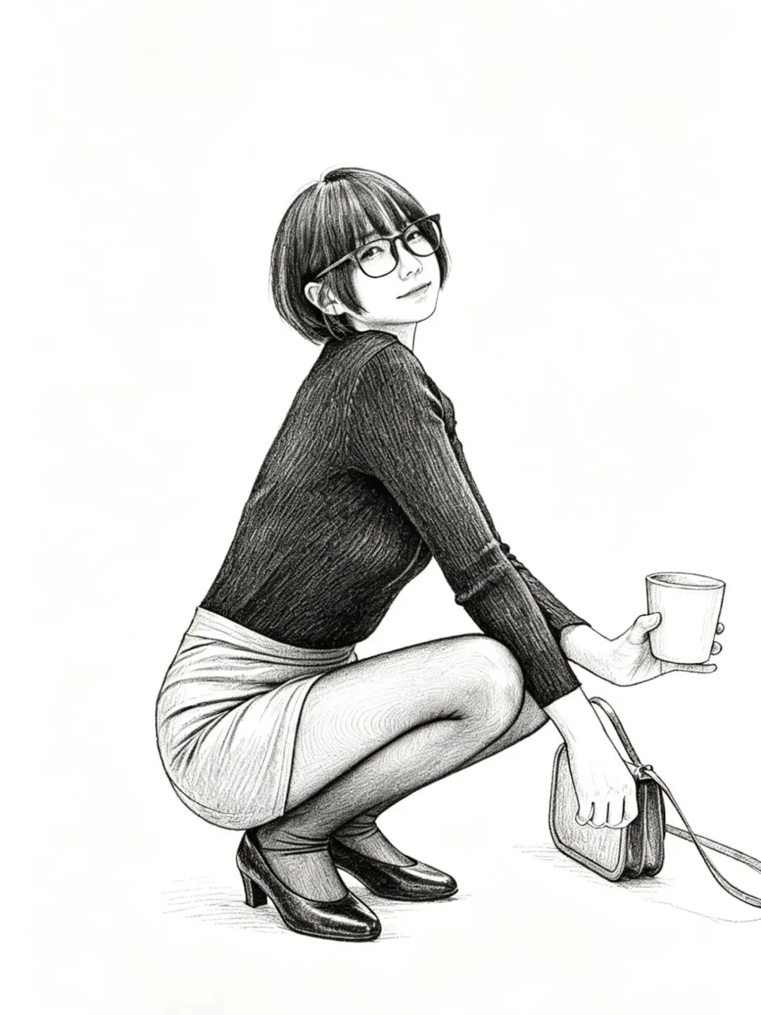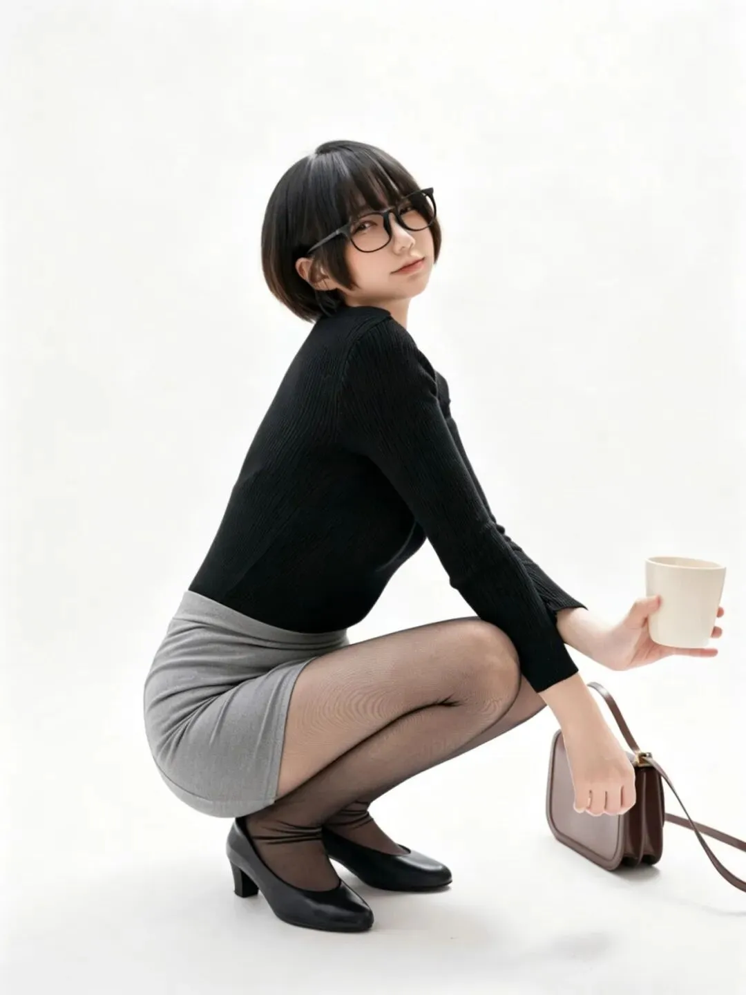 • 细节亮点:深蹲的姿态完美展现腿部线条,黑丝的网纹,真实感十足;针织衫的褶皱随身体姿态自然变化,挎包的细节清晰;画面构图均衡,动态感十足。