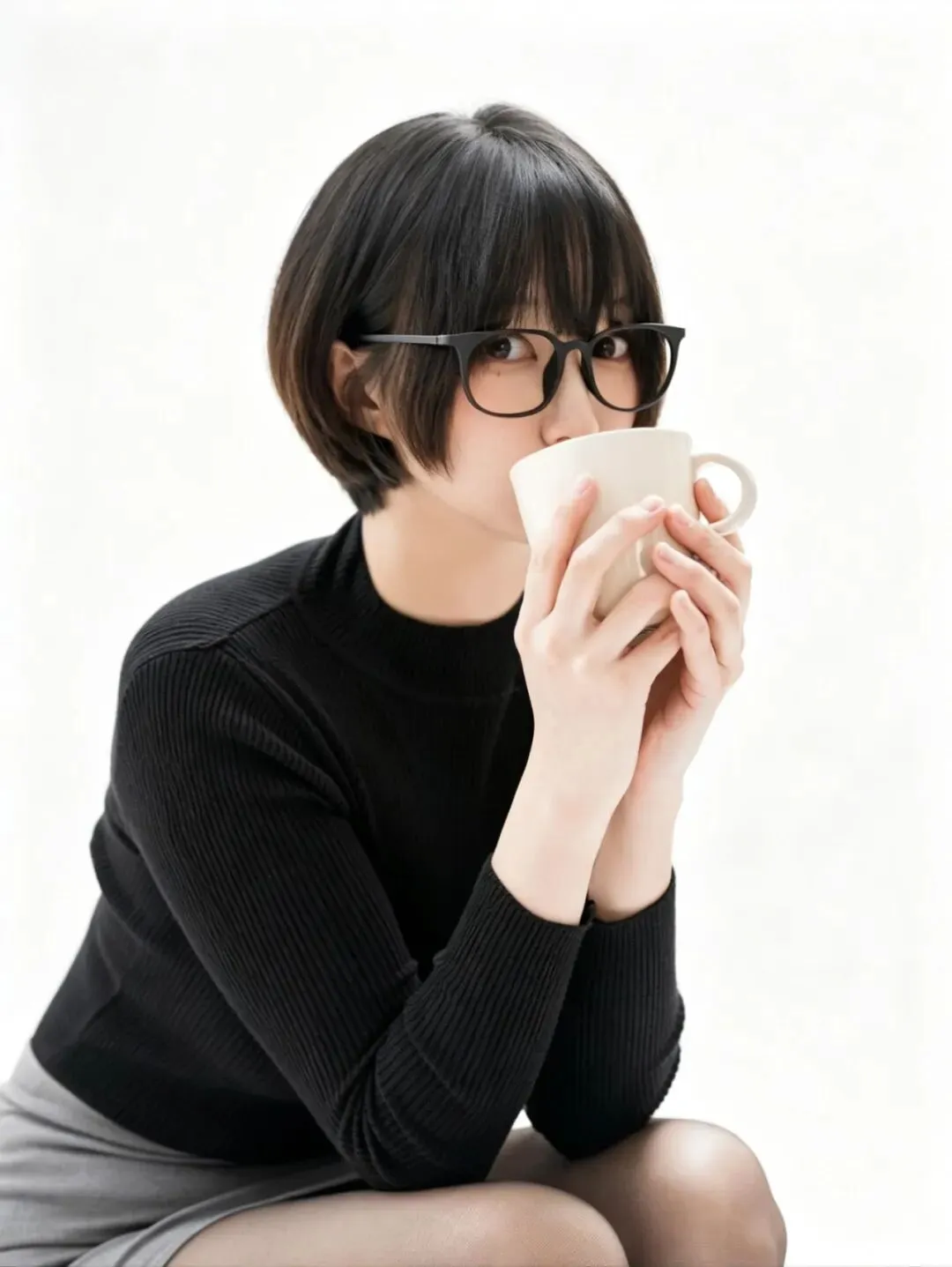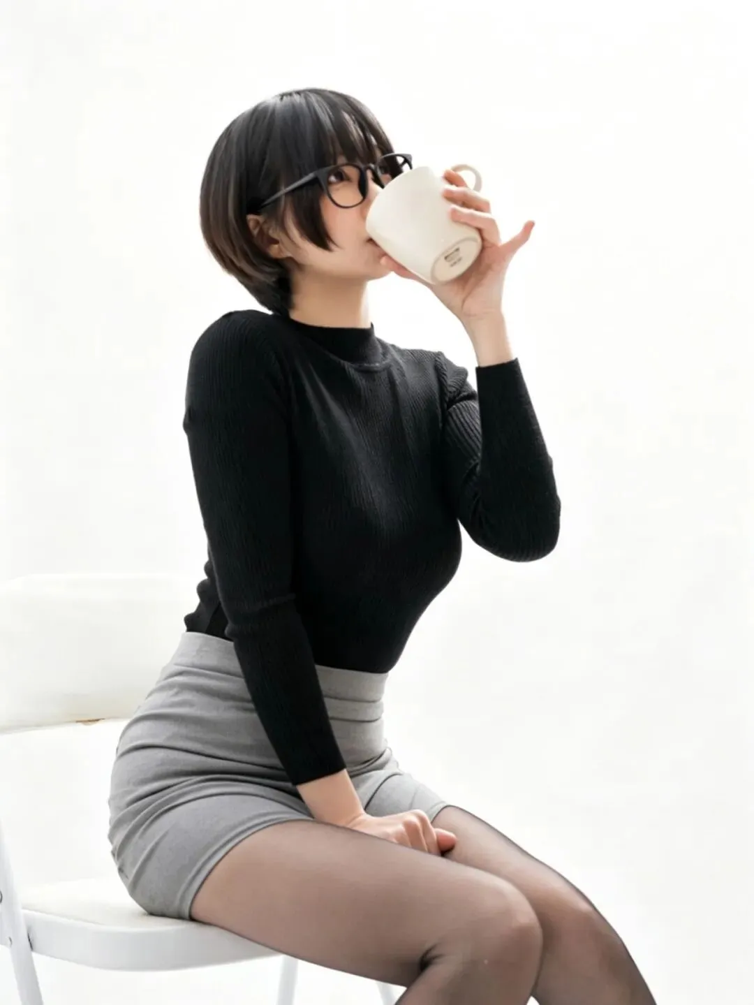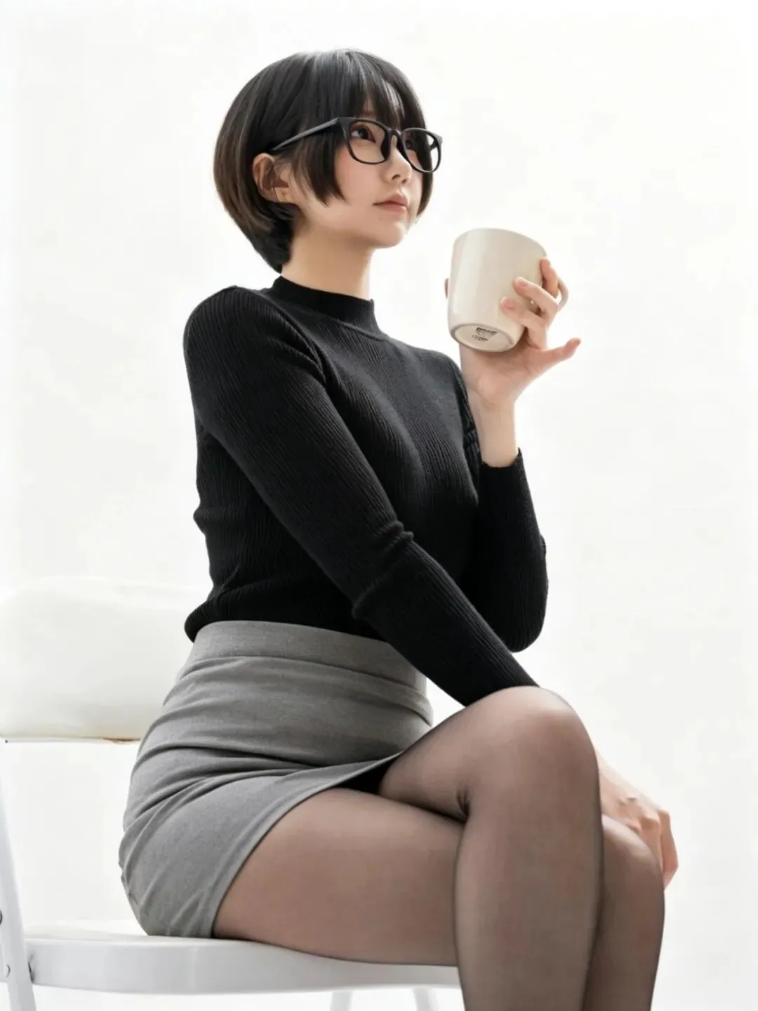 • 细节亮点:针织衫的修身版型凸显上半身线条,短裙的褶皱随坐姿自然变化;黑丝包裹的腿部线条流畅,光影层次分明;马克杯的细节清晰,真实感拉满。