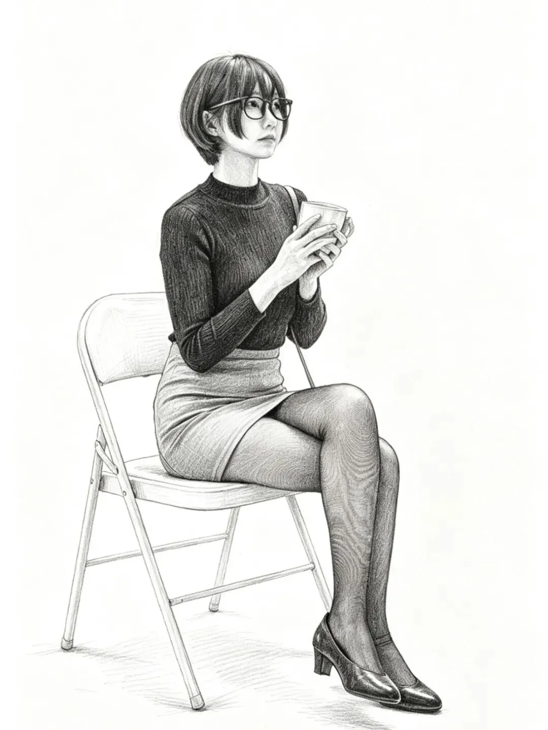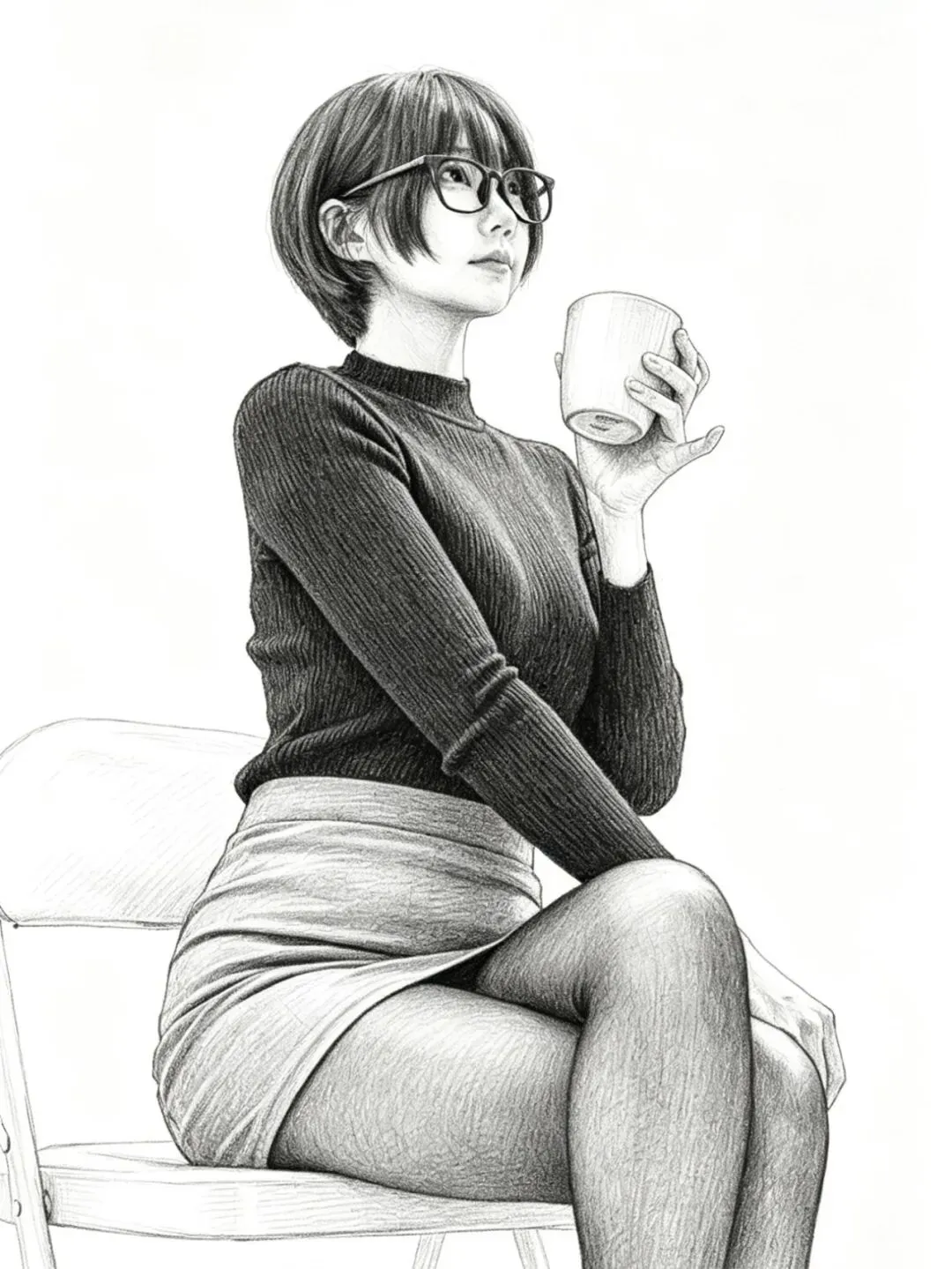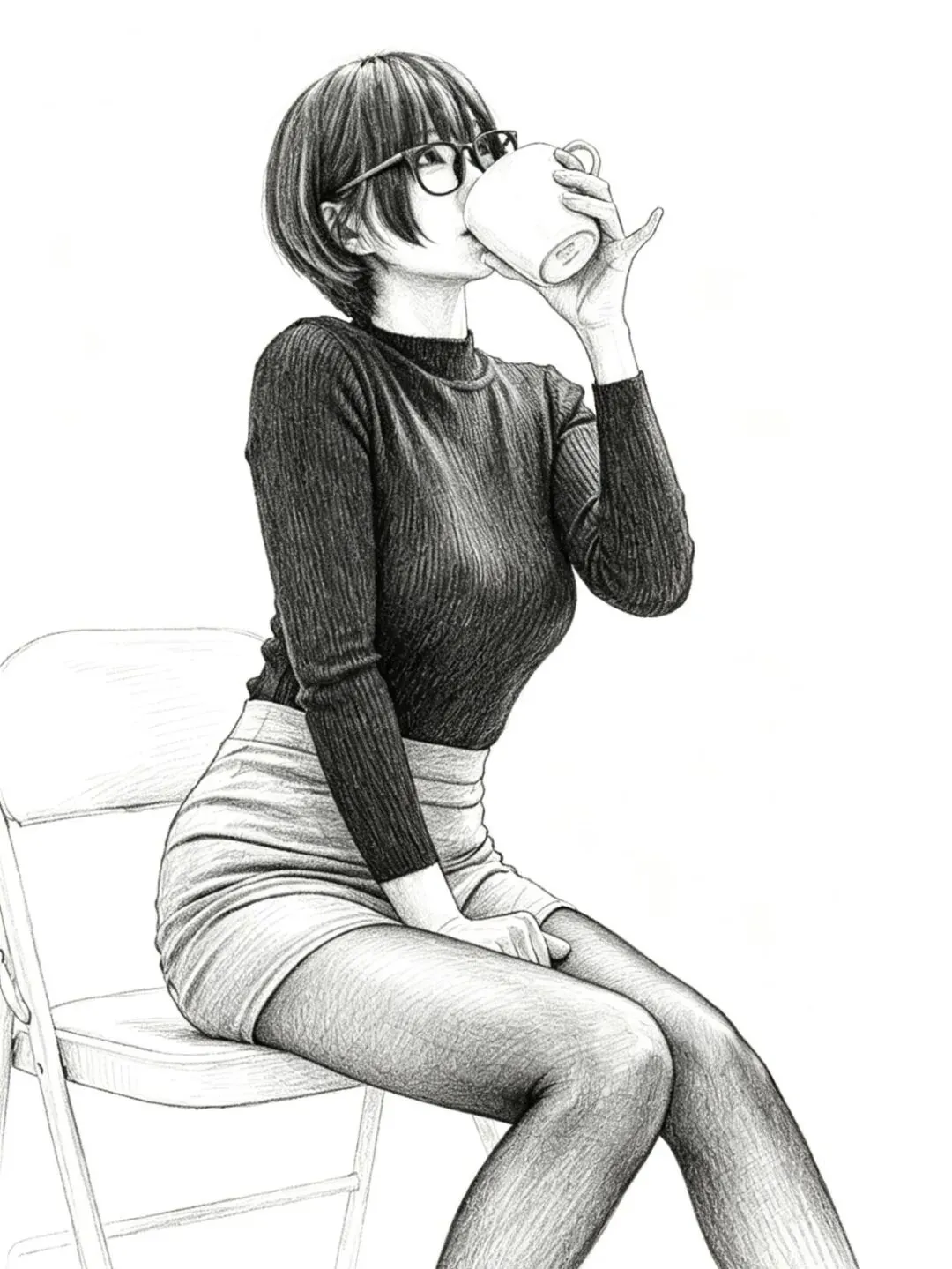 • 细节亮点:针织衫的修身版型凸显上半身线条,短裙的褶皱随坐姿自然变化;黑丝包裹的腿部线条流畅,光影层次分明;马克杯的细节清晰,真实感拉满。