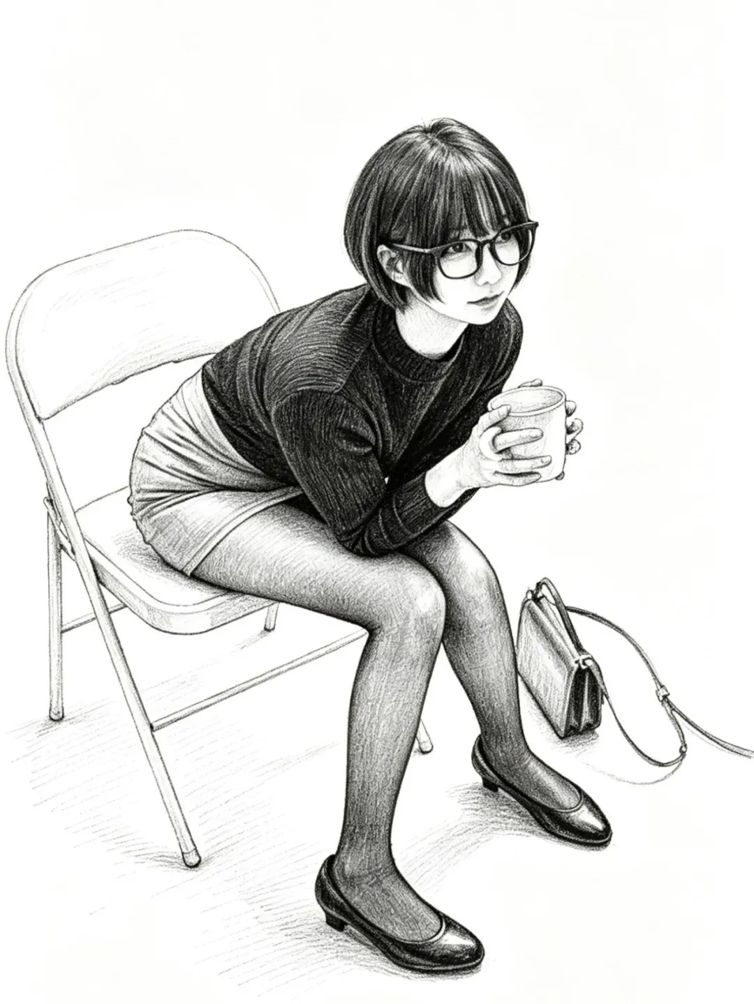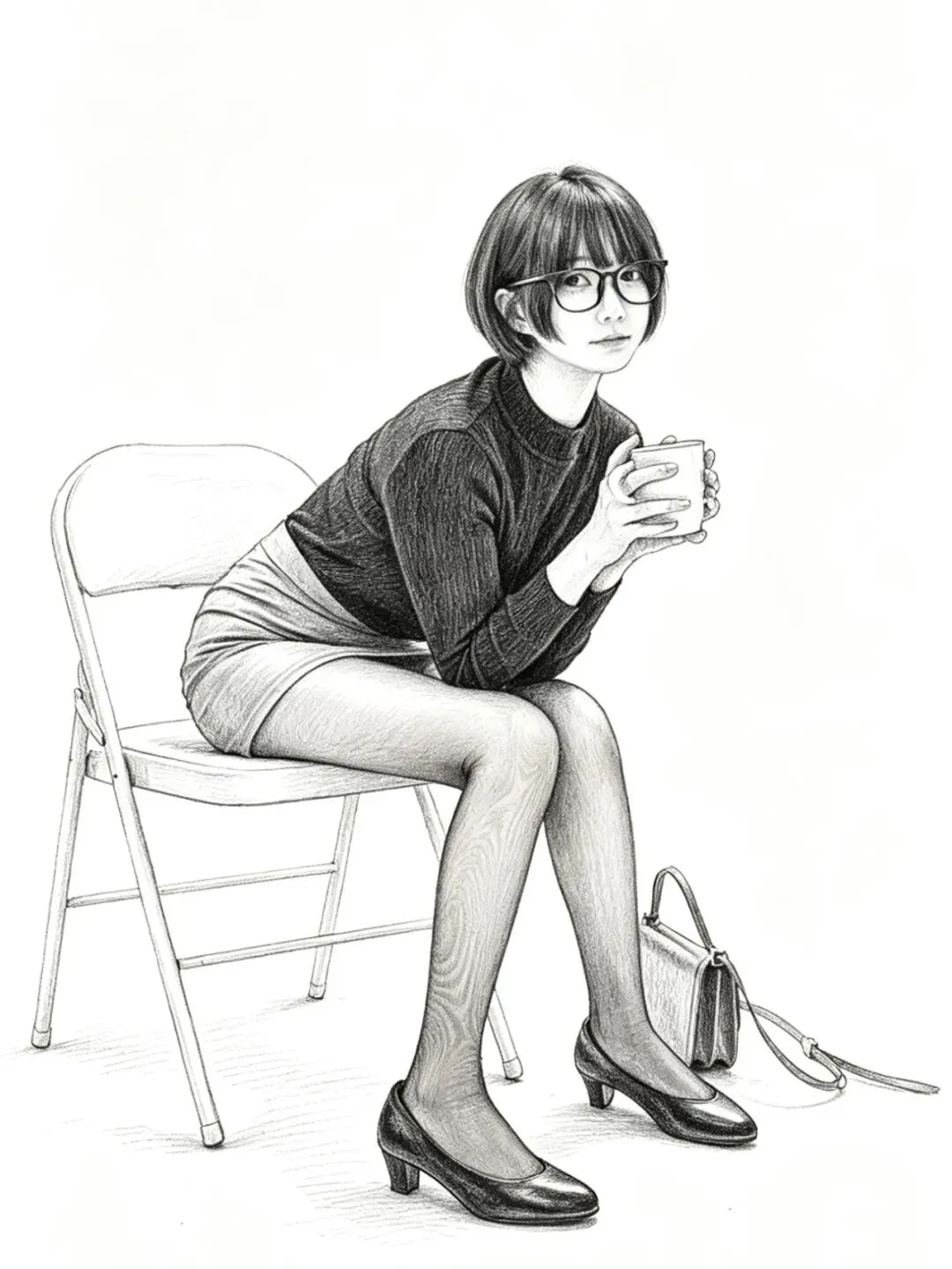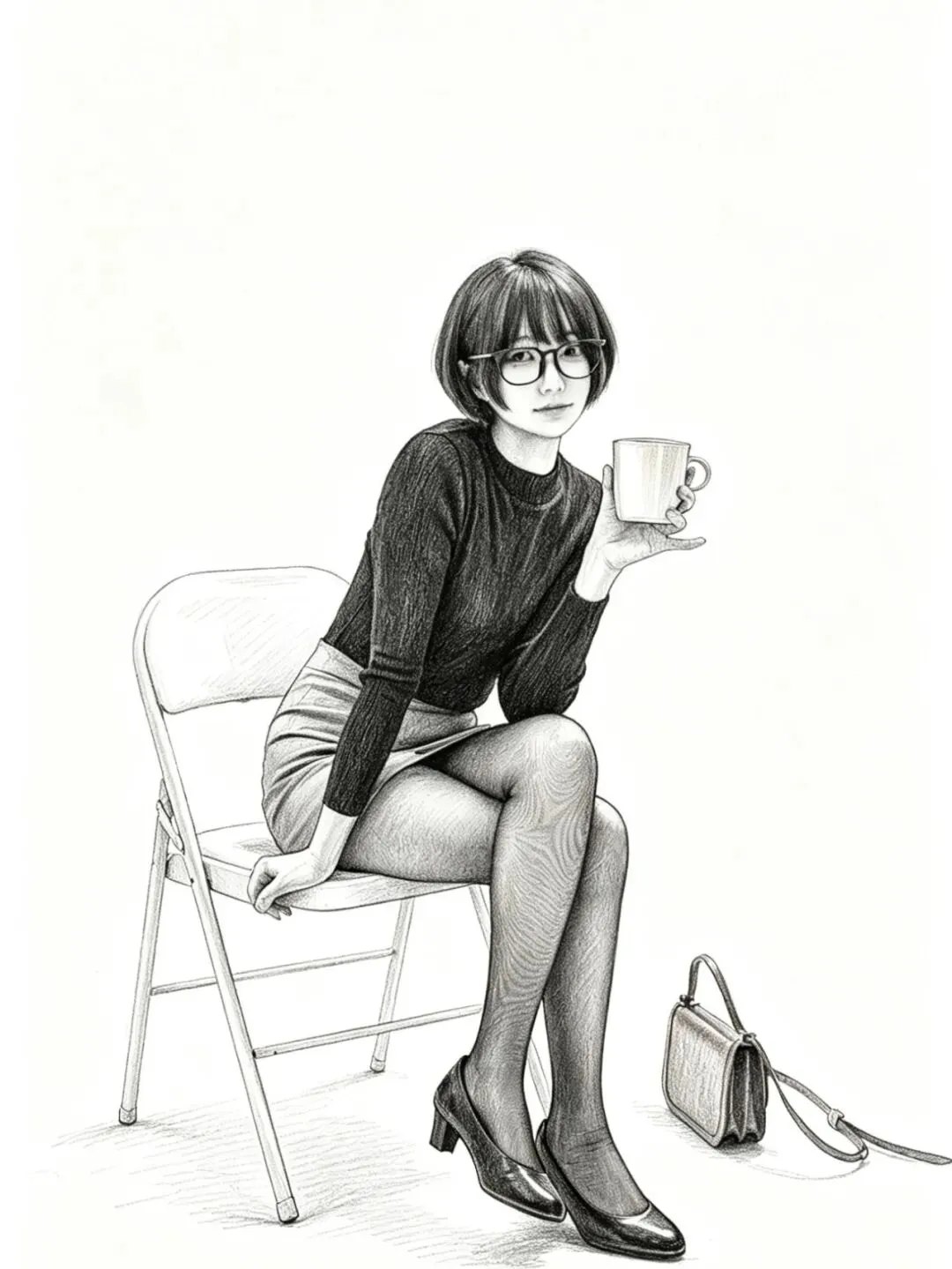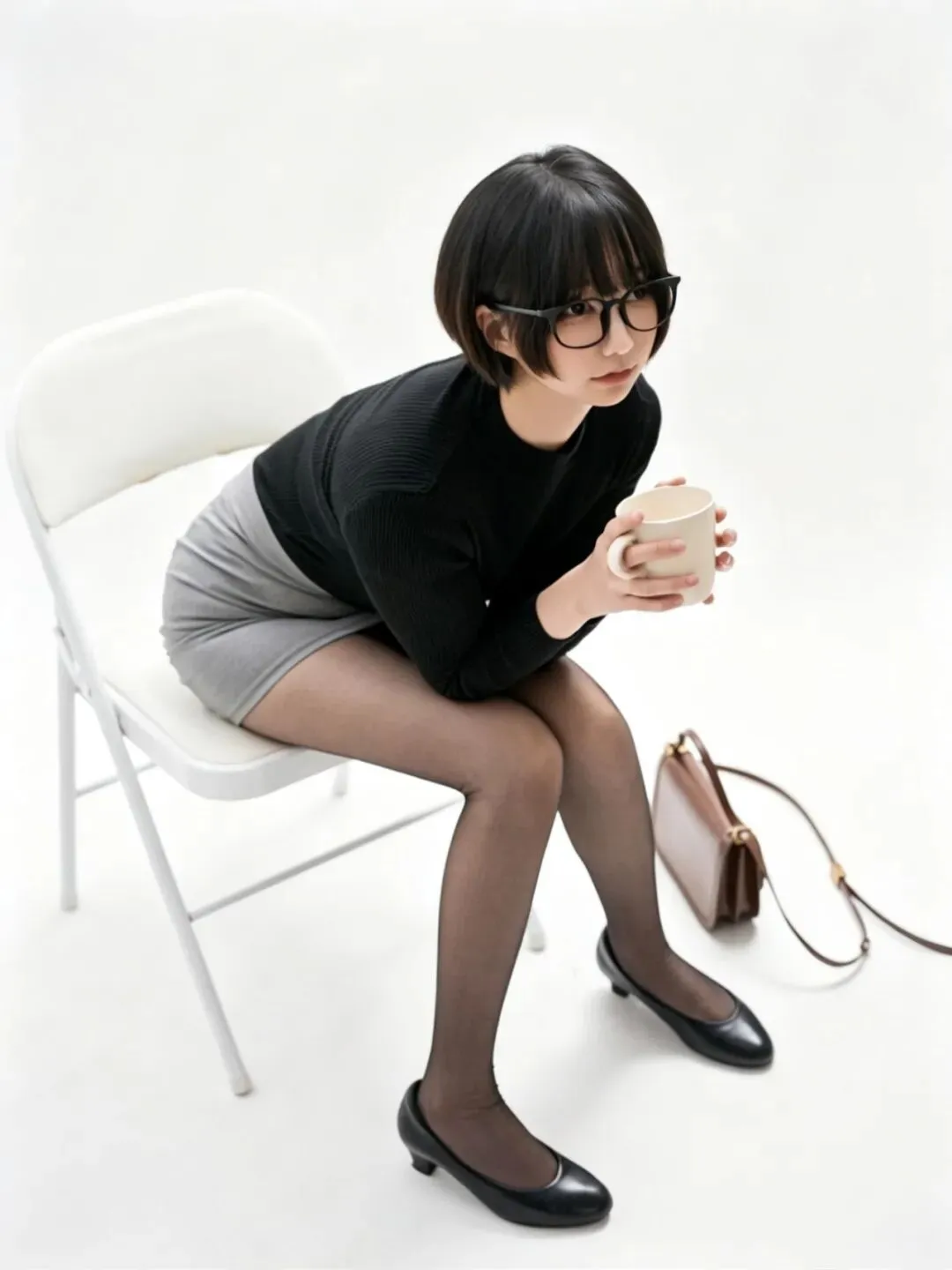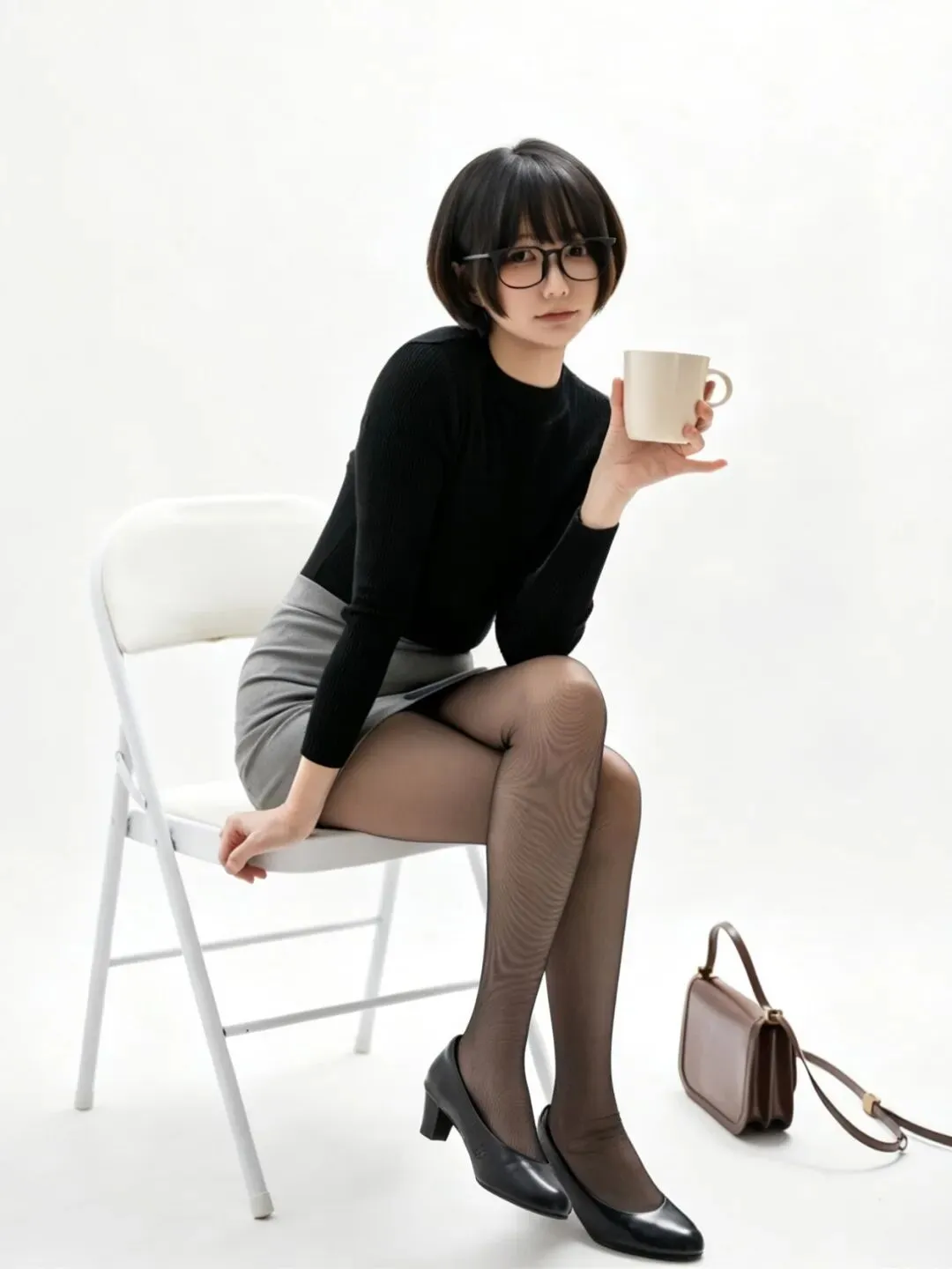 • 细节亮点:黑丝的网纹纹理、腿部肌肉线条被光线完美呈现;黑色针织衫的坑条褶皱自然,贴合身形;白色椅子的透视结构准确,地面投影强化了空间感;右侧的棕色挎包作为道具,平衡了画面构图。