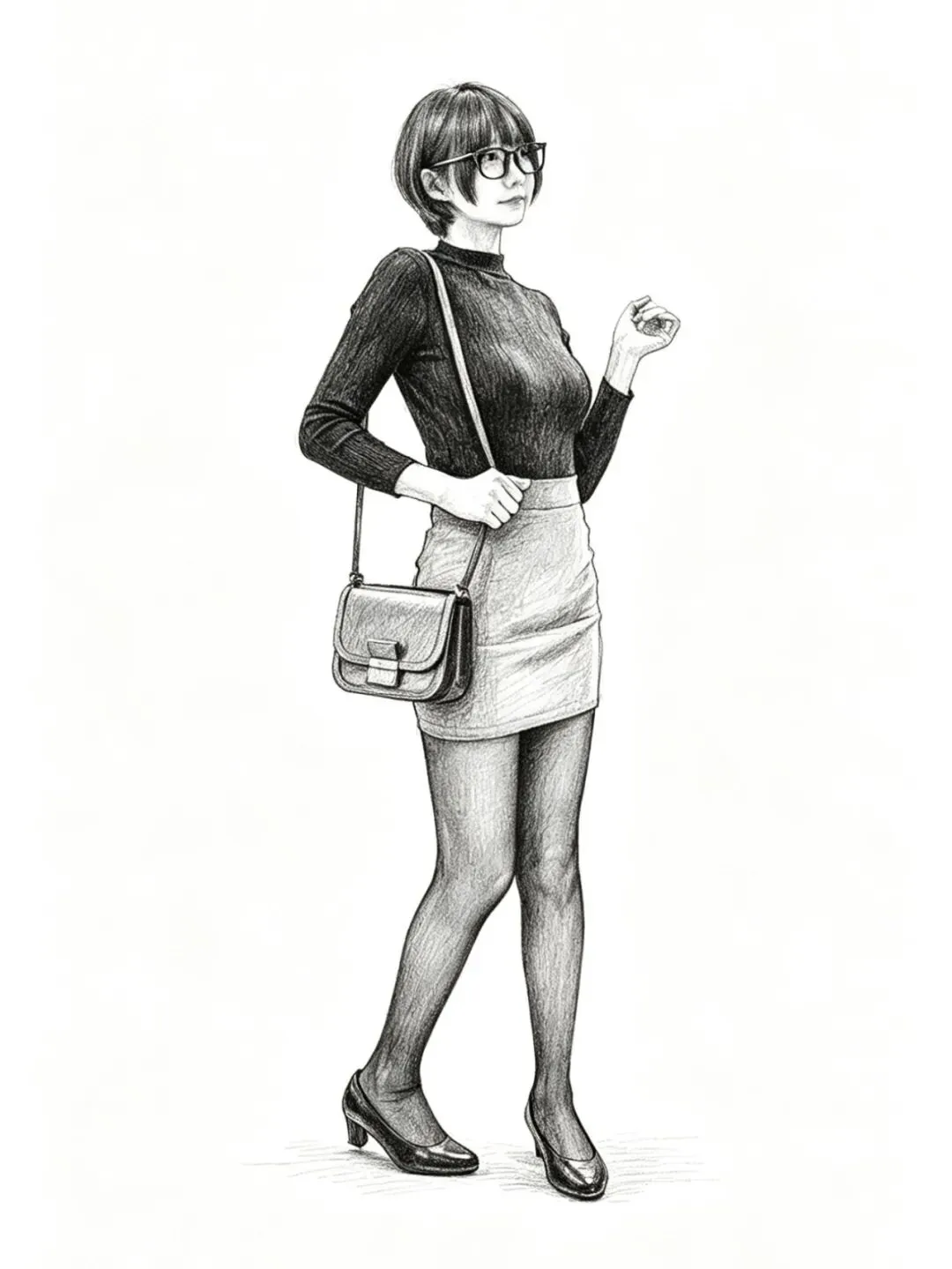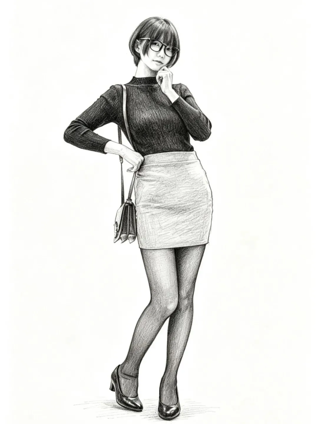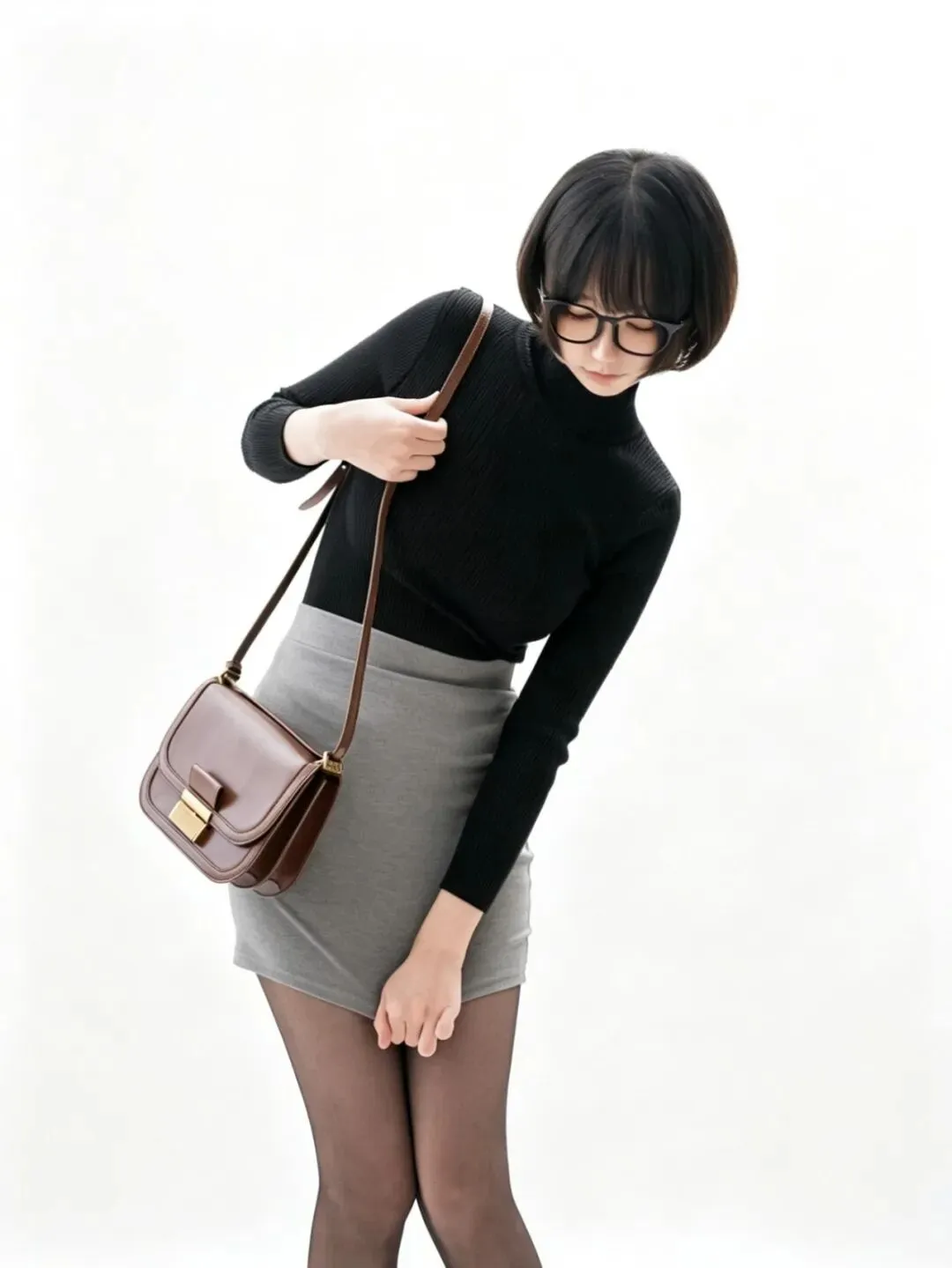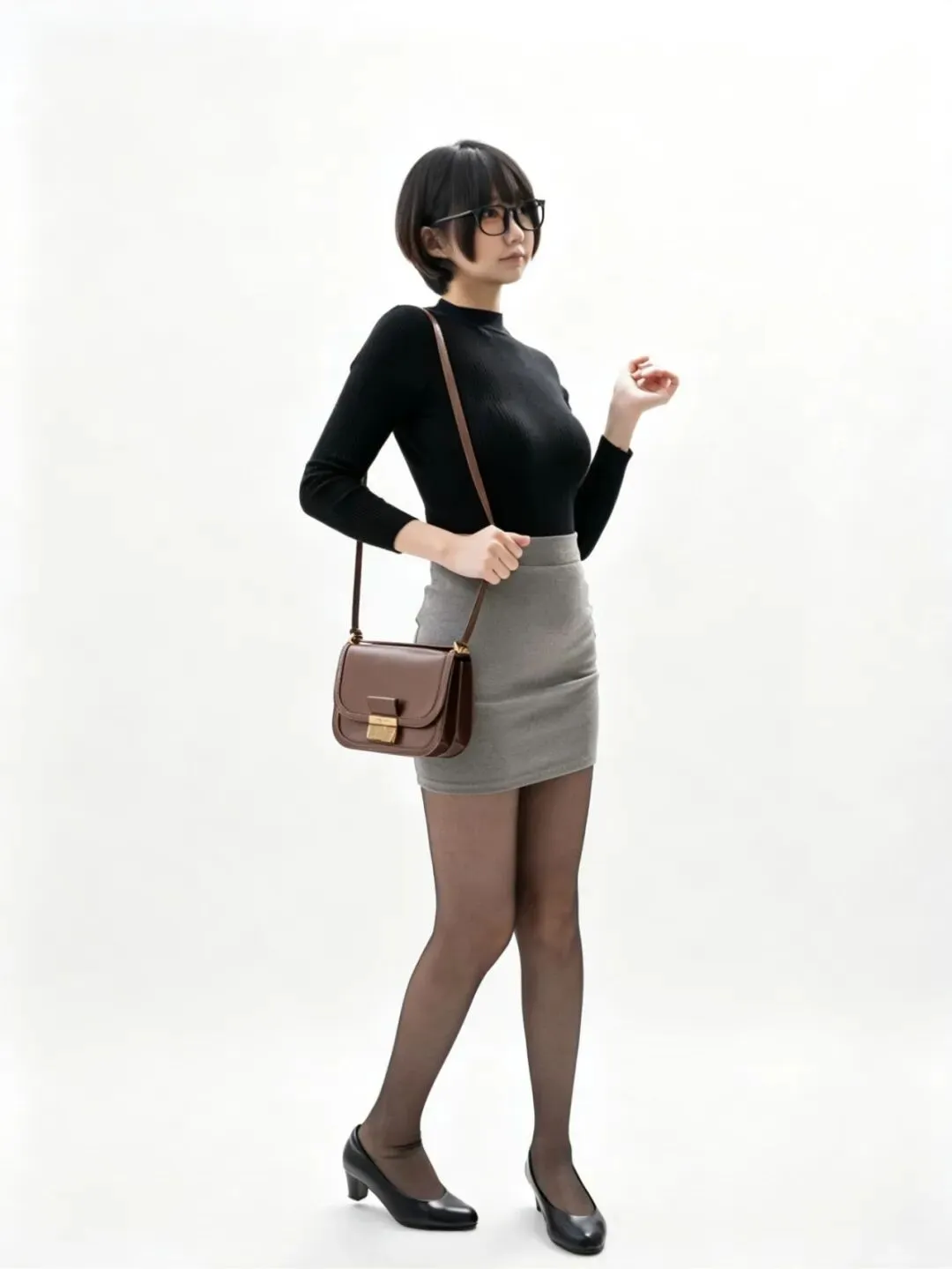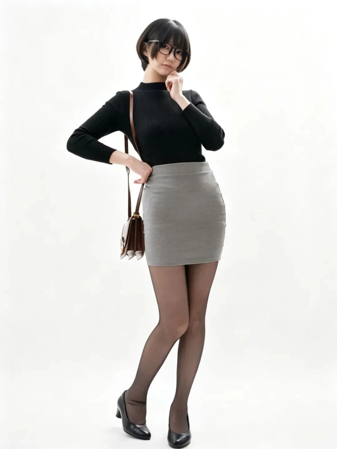 • 细节亮点:全身造型完整,穿搭比例协调;挎包的金属扣、皮革纹理细节清晰;黑丝包裹的腿部线条流畅,皮鞋的光泽感凸显质感;纯白背景让人物主体更突出,适合做全身穿搭展示。