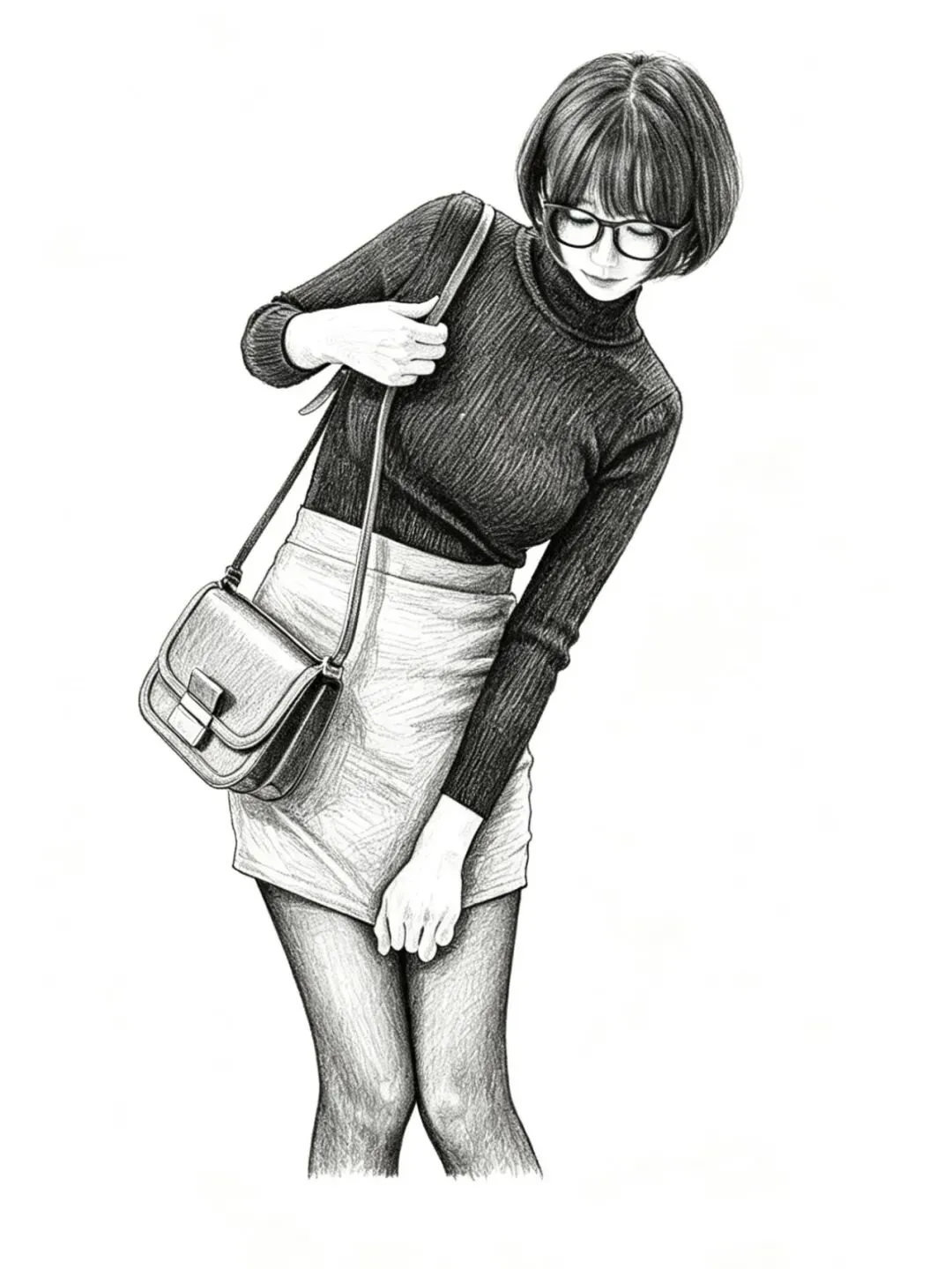 •  细节亮点:黑丝的通透感、皮鞋的皮革光泽被精准还原;针织衫的褶皱随身体姿态自然变化,真实感拉满;右侧挎包的位置让画面构图更均衡,避免单调。