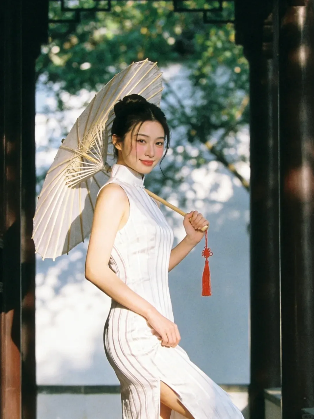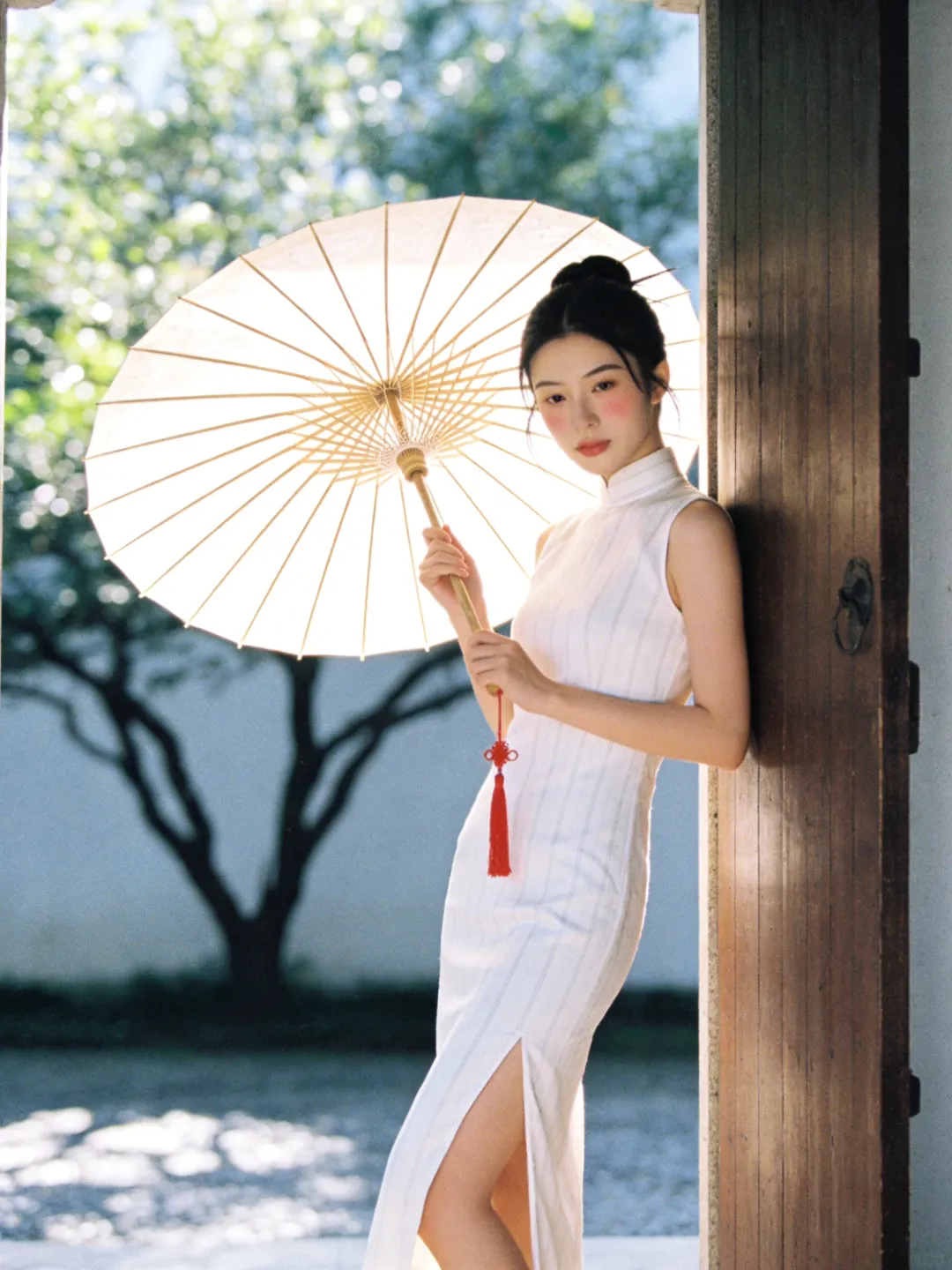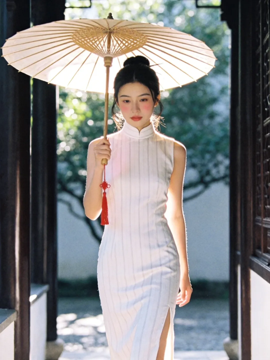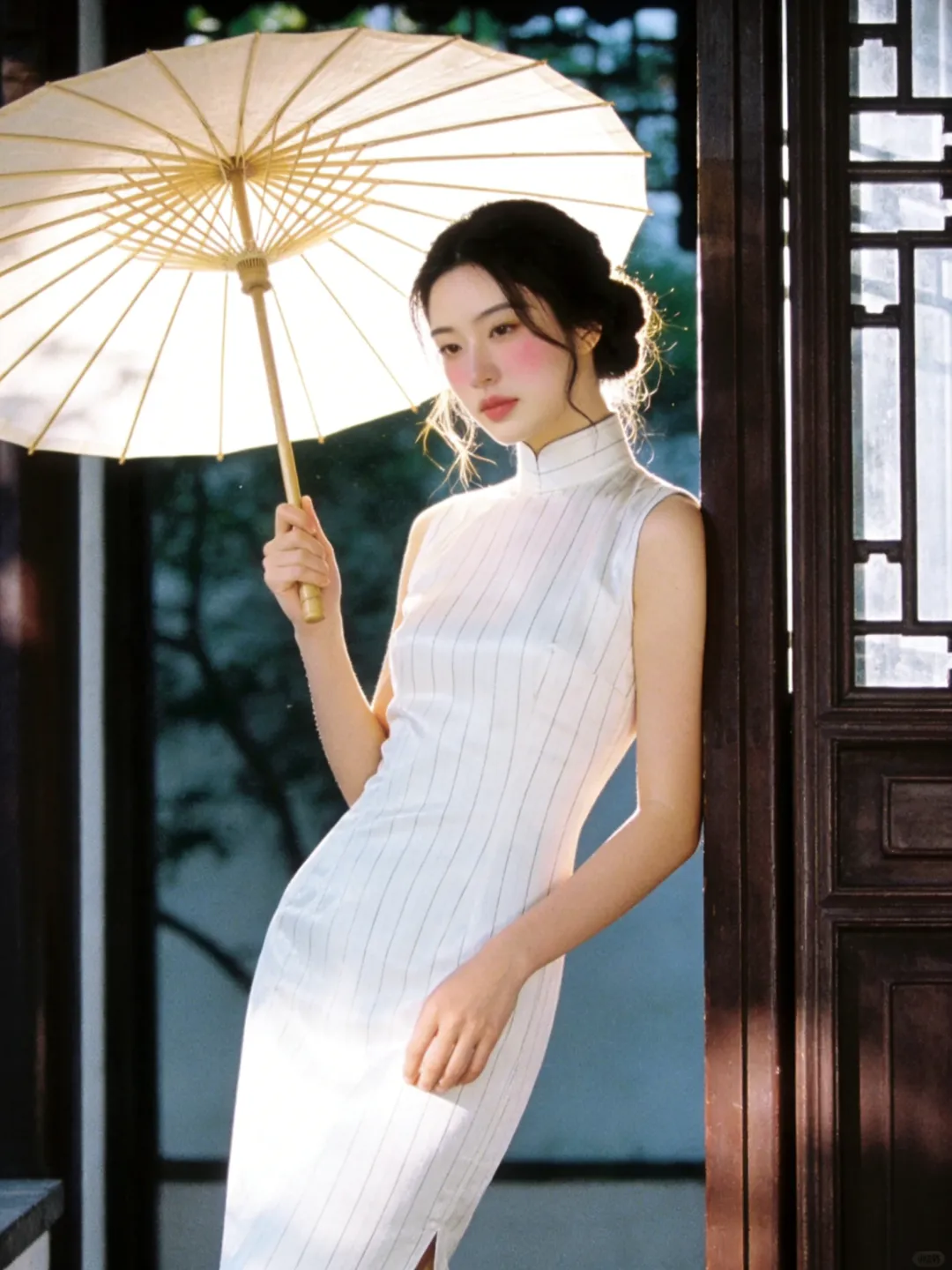 服饰细节:白色竖条纹无袖旗袍,高领设计,侧面开衩,丝绸质感,垂坠顺滑,简约大气又不失优雅,贴合身形尽显温婉气质。