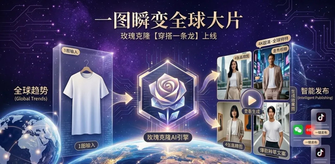一张衣服图,通过“玫瑰克隆”,你可以瞬间裂变成几十组不同模特、不同场景的素材。