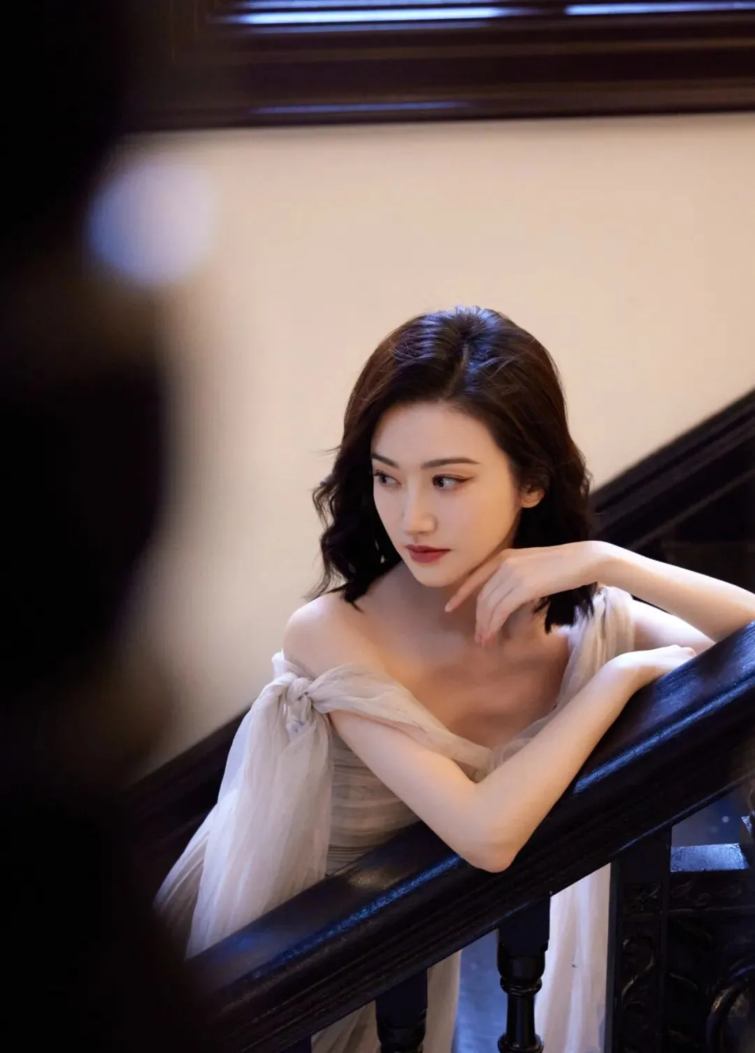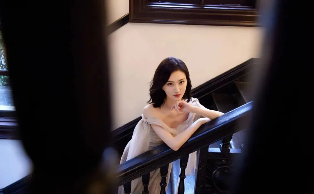 如果是在楼梯,栏杆这种位置拍照,可以把一只手臂自然搭在扶手上,另一只手轻轻托住下巴,记得手指要放松,不要太用力,身体微微前倾一点点,脸朝镜头或者轻轻侧过去,都很好看,这样的姿势特别修饰脸型,能让下颌线更清晰,上半身也会显得纤细,整体氛围是很优雅的,有一种慵懒又高级的松弛感